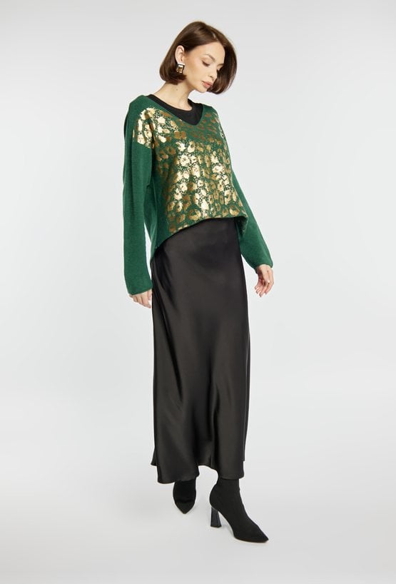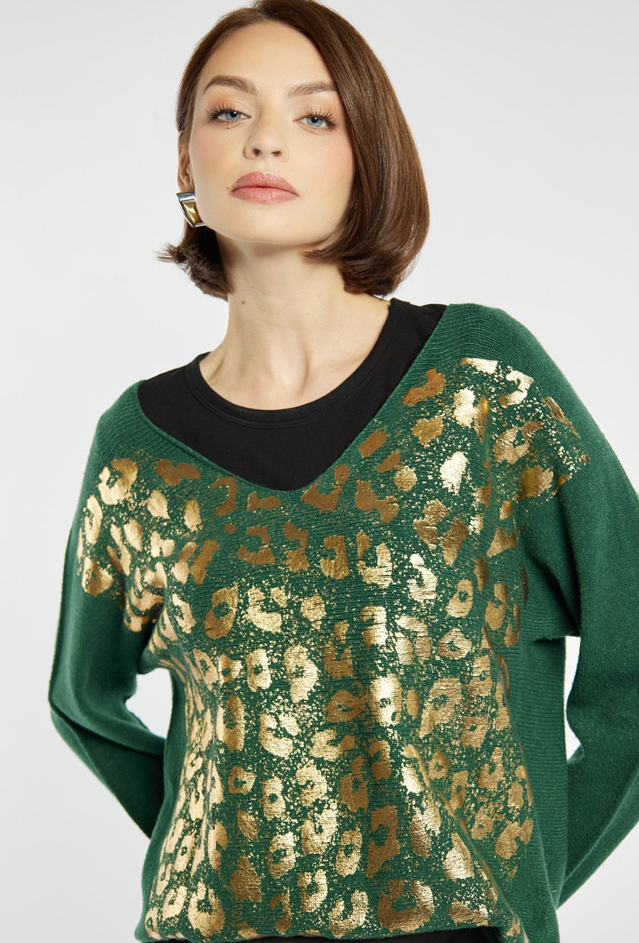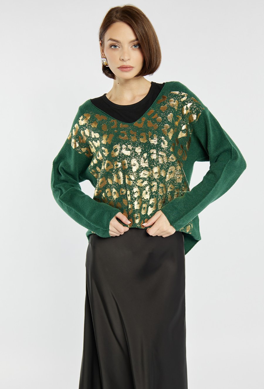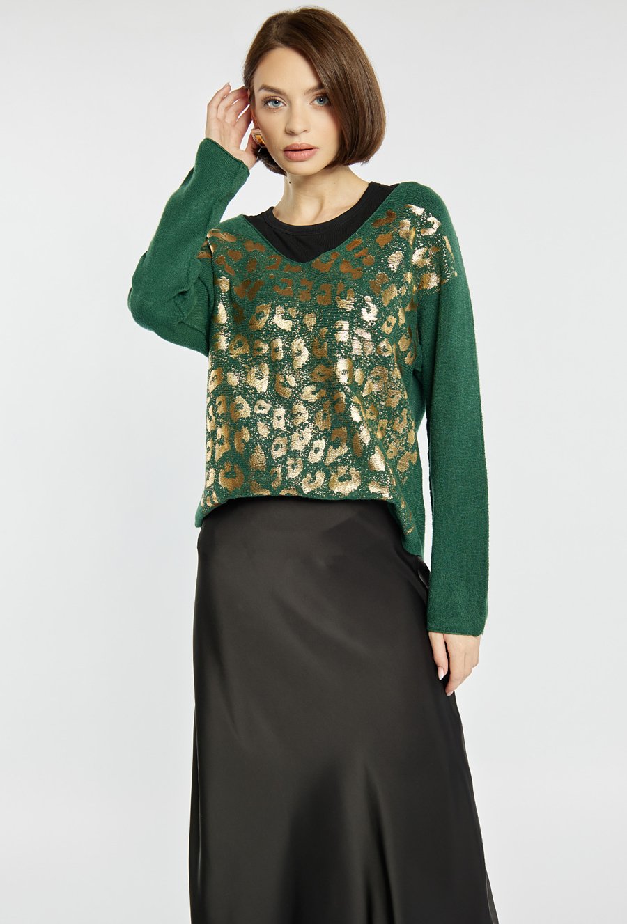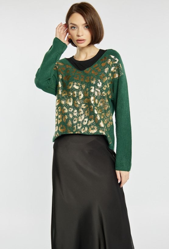 Sweter z efektownym, połyskującym nadrukiem w zwierzęcy wzór, który nadaje całości wyrazistego charakteru. Sweter z okrągłym dekoltem doskonale sprawdzi się zarówno w eleganckich, jak i bardziej casualowych stylizacjach. Model ten zapewnia komfort i styl przez cały dzień. Modelka na zdjęciu ma 177 cm wzrostu i prezentuje rozmiar S/M.