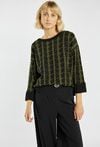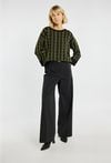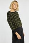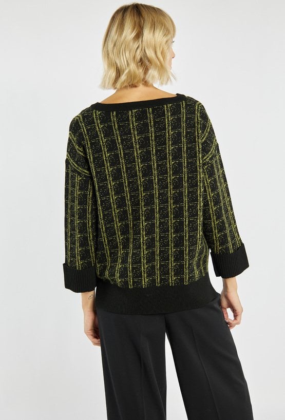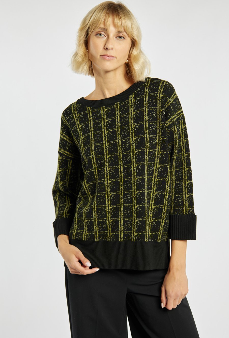 Sweter damski o luźnym kroju z obniżoną linią ramion, ozdobiony wyrazistym, geometrycznym wzorem. Wykończony szerokim ściągaczem przy rękawach i na dole, co nadaje mu nowoczesnego charakteru. Modelka na zdjęciu ma 177 cm wzrostu i prezentuje rozmiar S.