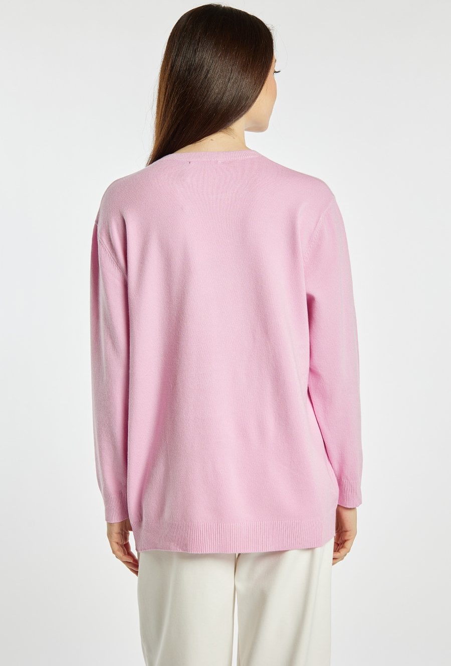 Sweter damski o klasycznym, wygodnym kroju. Model z długim rękawem oraz półokrągłym dekoltem. Całość zdobi subtelny, powtarzalny wzór z drobnym motywem owocowym, który nadaje stylizacji lekkości i dziewczęcego charakteru. Modelka na zdjęciu ma 177 cm wzrostu i prezentuje rozmiar S/M
