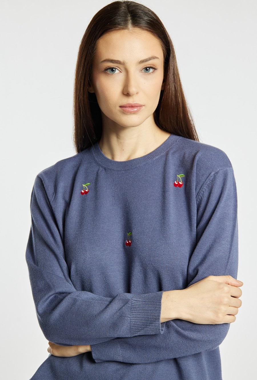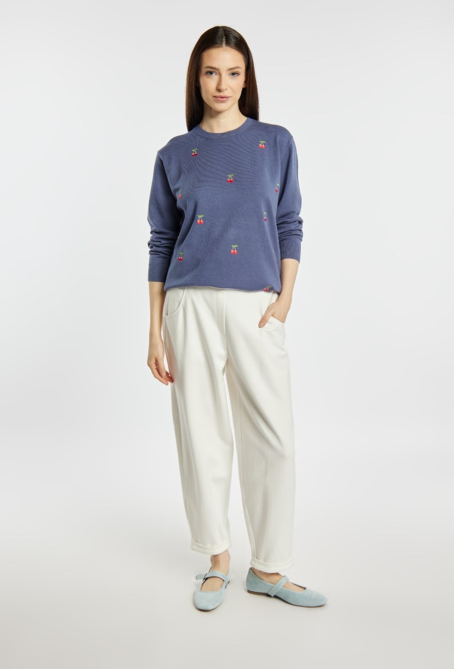 Sweter damski o klasycznym, wygodnym kroju. Model z długim rękawem oraz półokrągłym dekoltem. Całość zdobi subtelny, powtarzalny wzór z drobnym motywem owocowym, który nadaje stylizacji lekkości i dziewczęcego charakteru. Modelka na zdjęciu ma 177 cm wzrostu i prezentuje rozmiar S/M