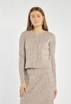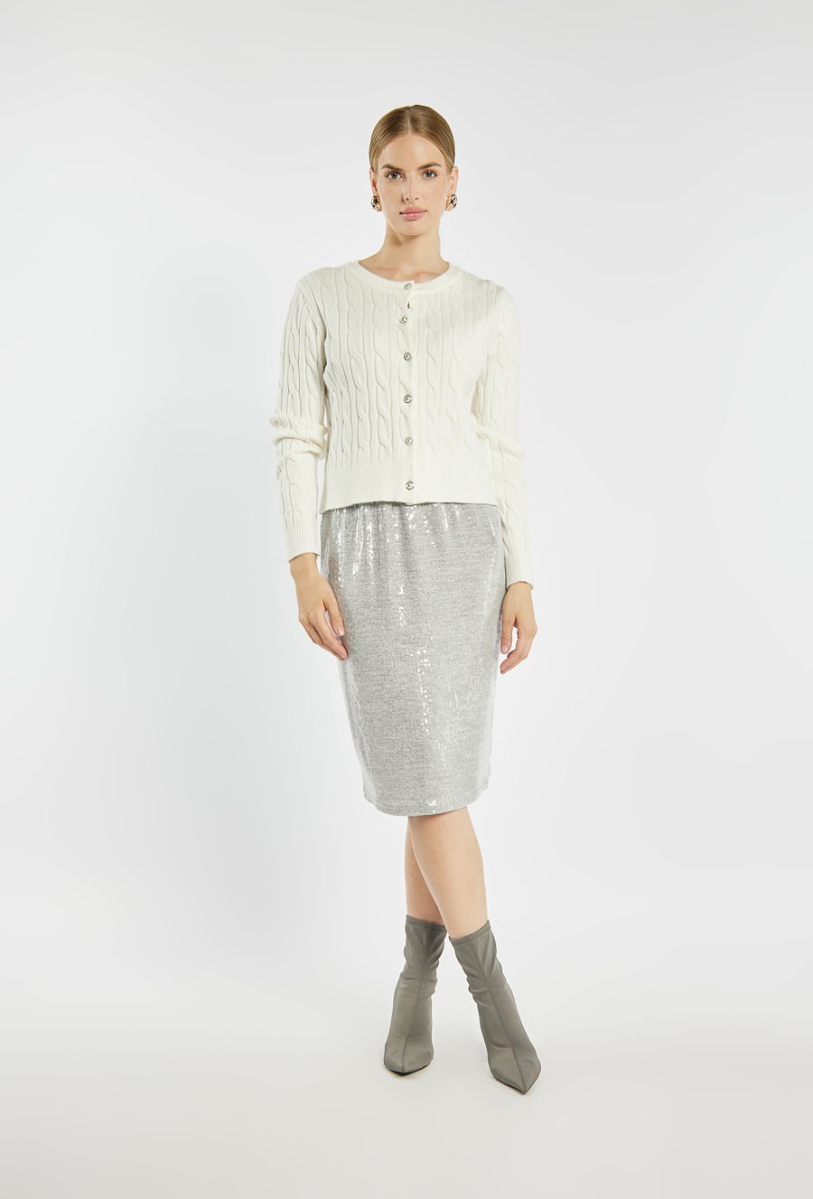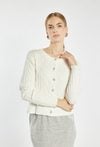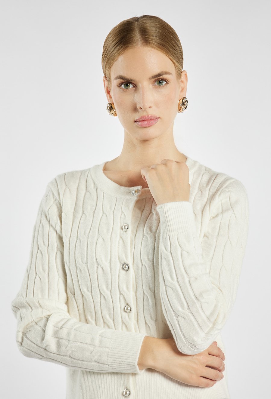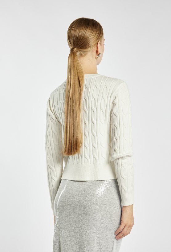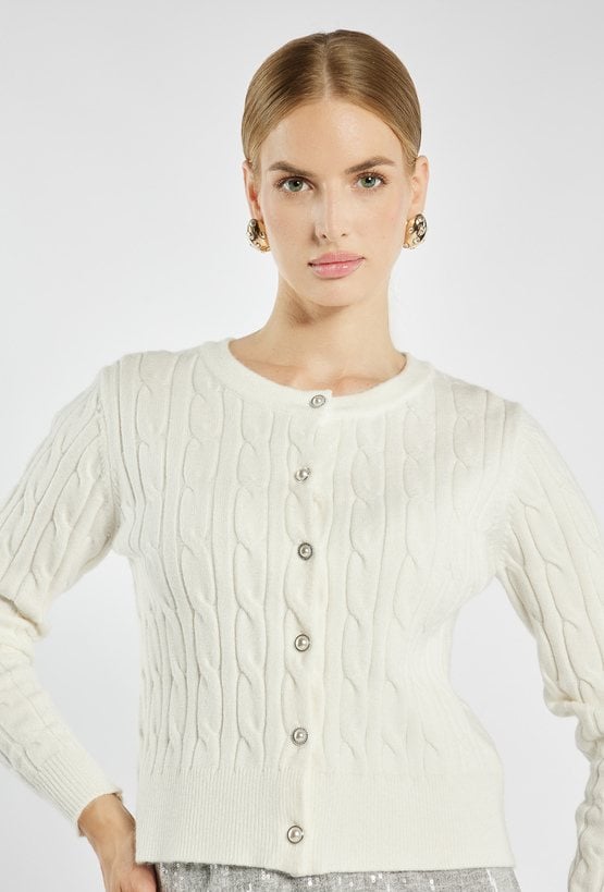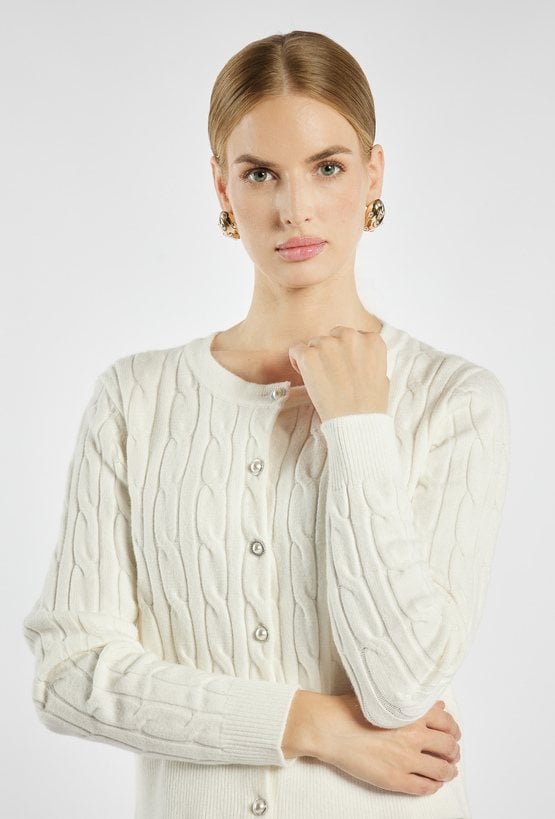 Stylowy sweter zapinany na guziki o plecionym splocie warkoczowym. Model o klasycznym kroju z okrągłym dekoltem i biżuteryjnymi guzikami, które dodają elegancji. Modelka na zdjęciu ma 177 cm wzrostu i prezentuje rozmiar S.