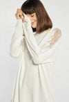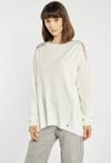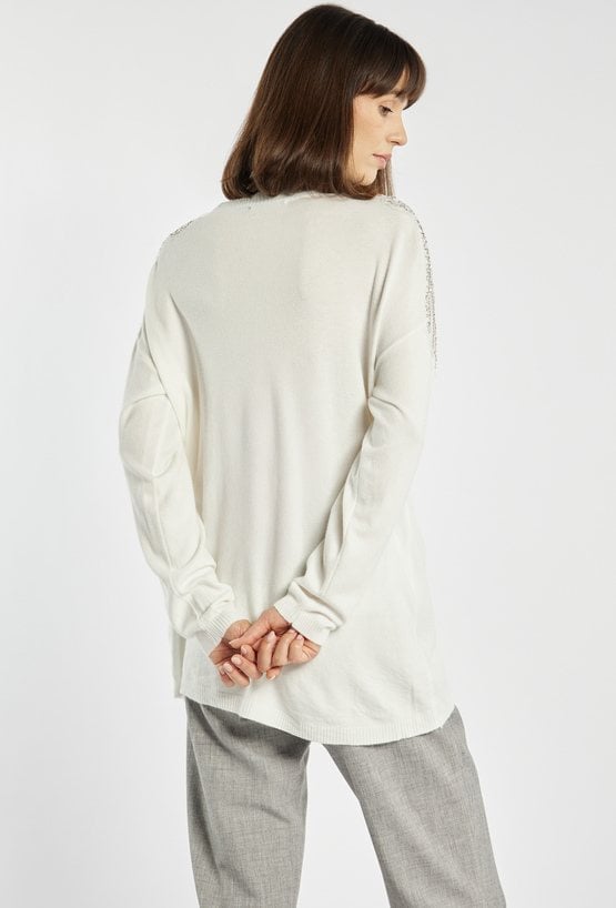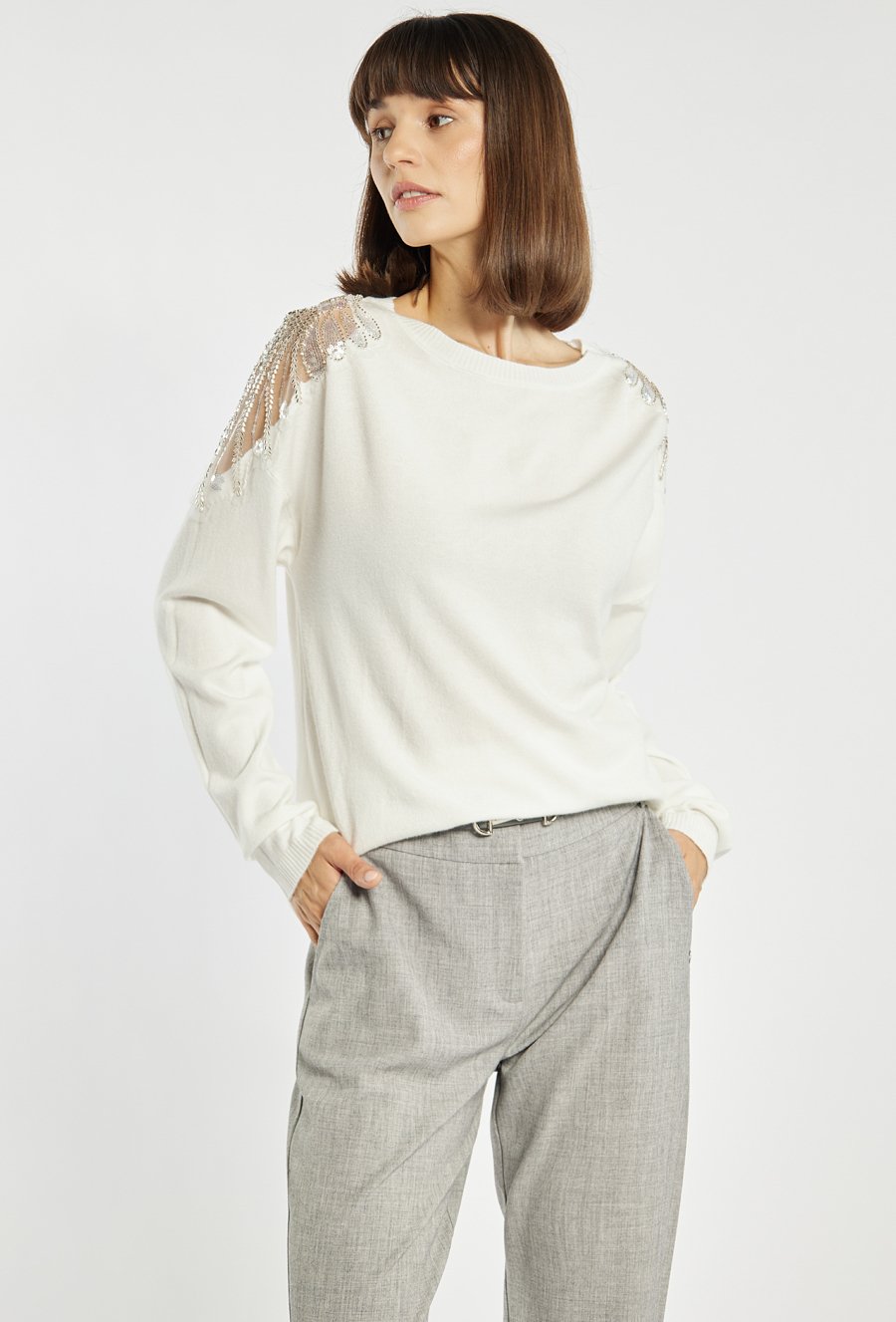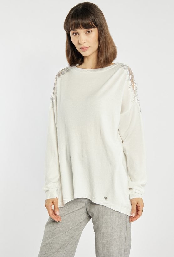 Sweter o prostym, luźnym kroju z długim rękawem i okrągłym dekoltem. Wyróżnia się zdobieniami na ramionach w formie koralików. Idealny wybór na stylizacje, w których chcesz połączyć wygodę z nutą wyrafinowania. Modelka na zdjęciu ma 177 cm wzrostu i prezentuje rozmiar S/M.
