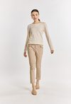 Wiskozowy sweter damski z dodatkiem elastycznych włókien. Sweter z długimi rękawami, półokrągłym dekoltem oraz delikatnym wzorem na przodzie. Model ten z pewnością sprawdzi się na co dzień. Modelka na zdjęciu ma 177 cm wzrostu i prezentuje rozmiar S/M.