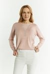 Wiskozowy sweter damski ze zdobieniem. Sweter z długimi rękawami oraz dżetami przy półokrągłym dekolcie. Model ten występuje w innych wariantach kolorystycznych i z pewnością sprawdzi się na wiele okazji. Modelka na zdjęciu ma 177 cm wzrostu i prezentuje rozmiar S/M.