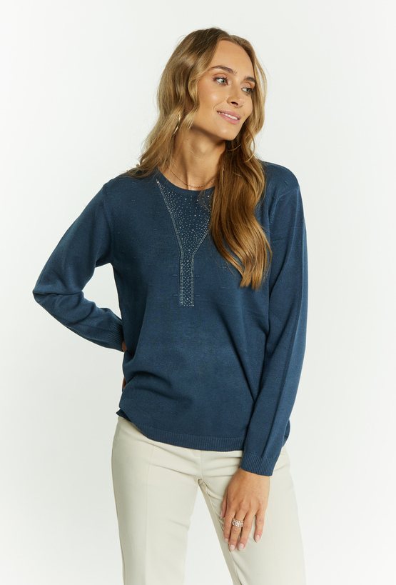 Wiskozowy sweter damski ze zdobieniem. Sweter z długimi rękawami oraz dżetami przy półokrągłym dekolcie. Model ten występuje w innych wariantach kolorystycznych i z pewnością sprawdzi się na wiele okazji. Modelka na zdjęciu ma 177 cm wzrostu i prezentuje rozmiar S/M.