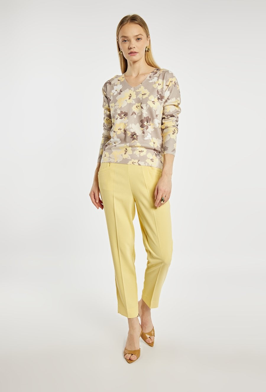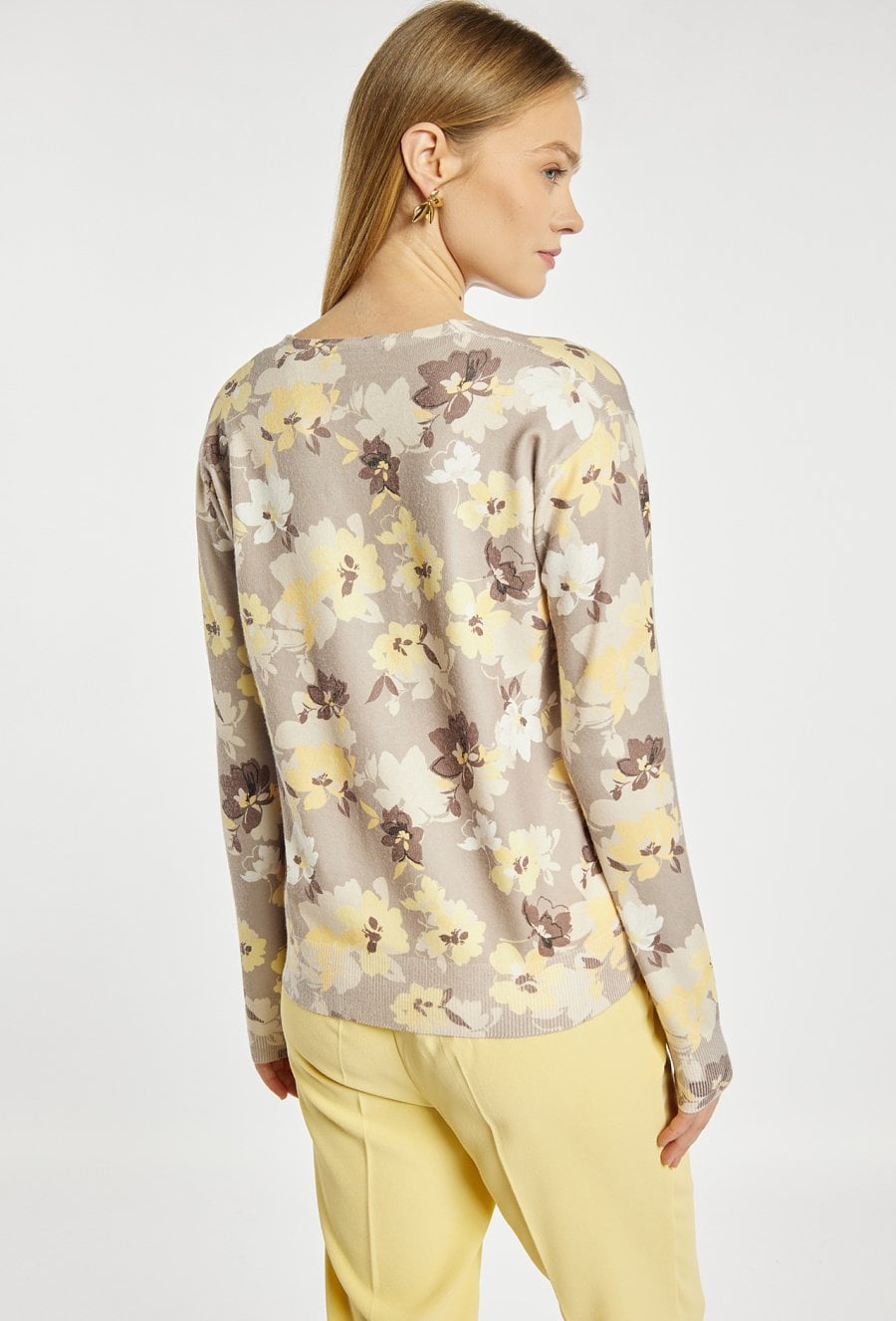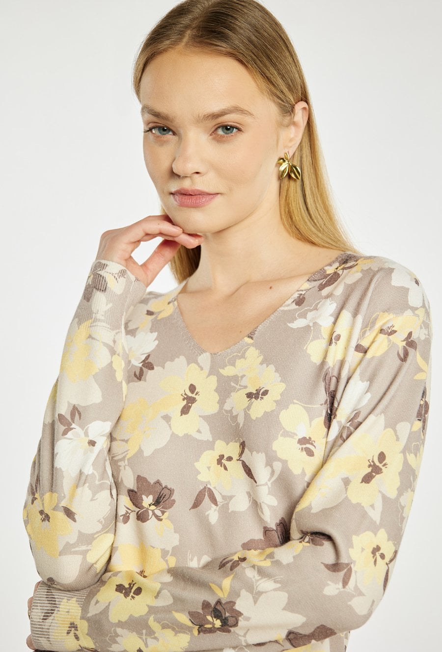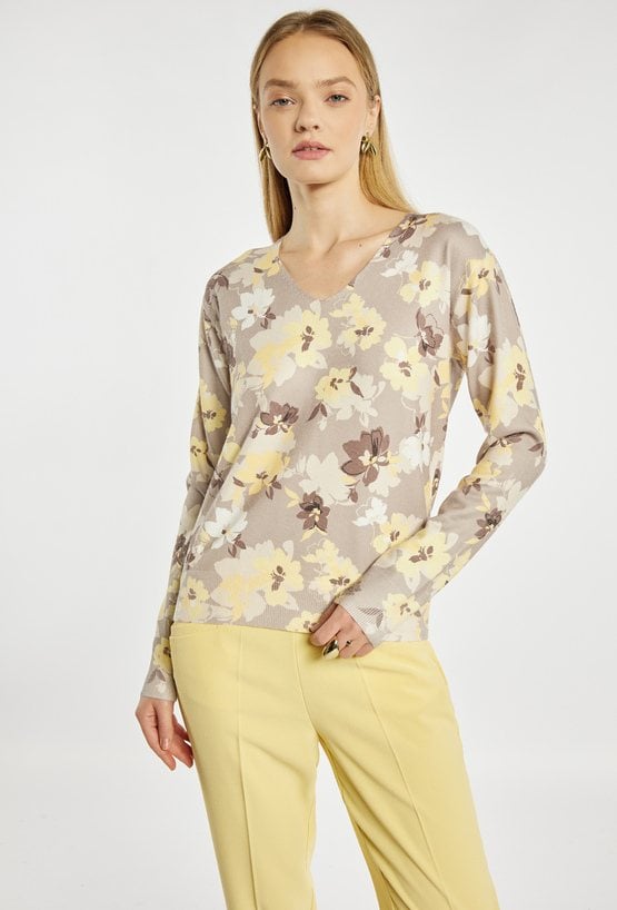 Sweter damski o klasycznym, komfortowym fasonie. Model z dekoltem w serek oraz długimi rękawami. Całość zdobi wzór, który nadaje swetrowi eleganckiego i kobiecego charakteru. Idealny do codziennych stylizacji. Modelka na zdjęciu ma 177 cm wzrostu i prezentuje rozmiar S.