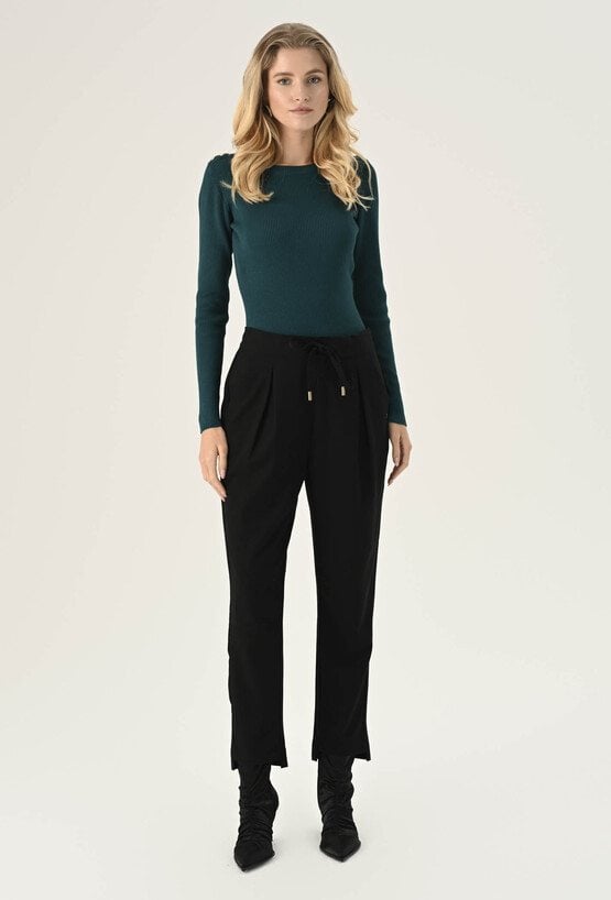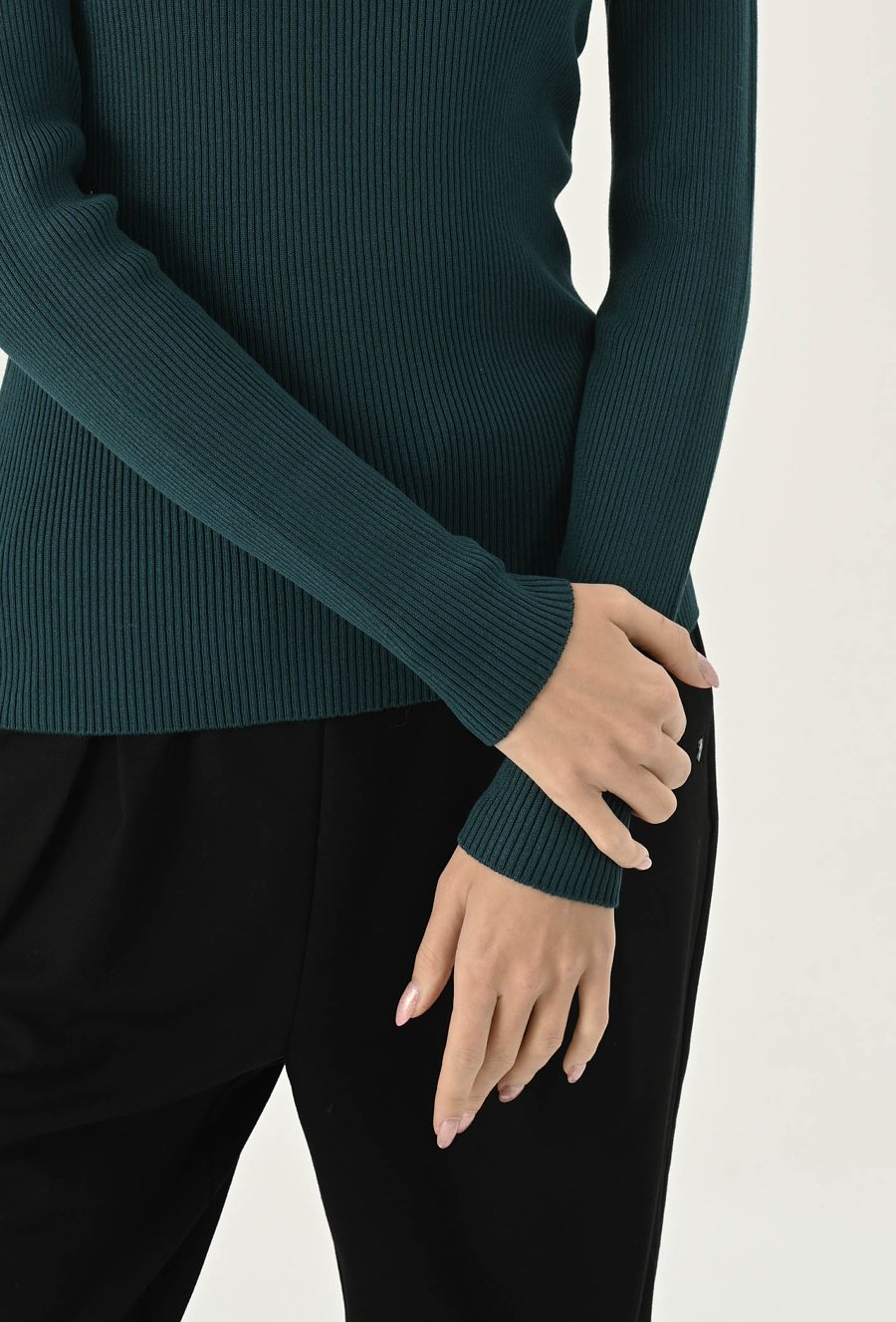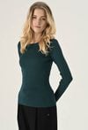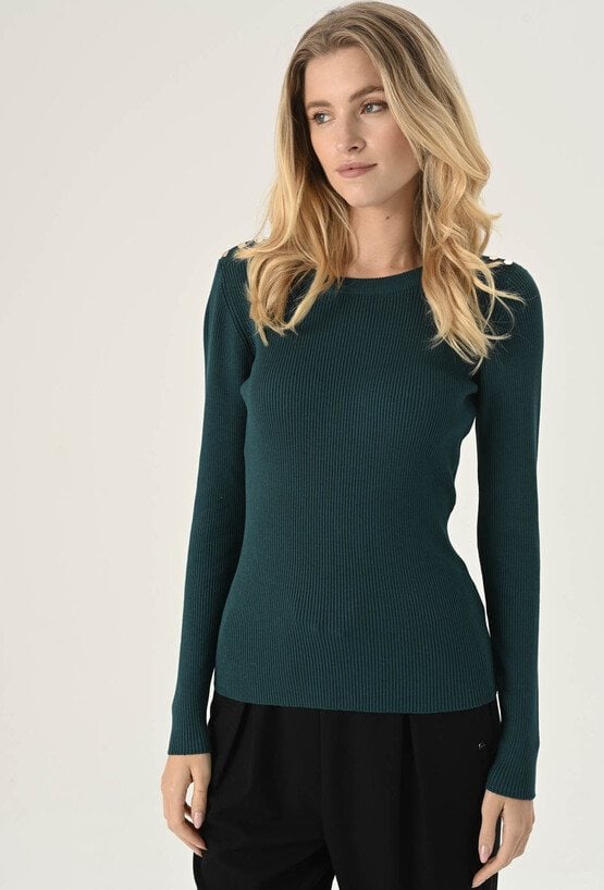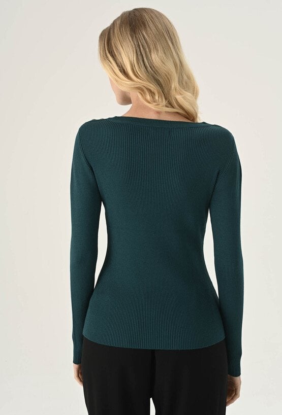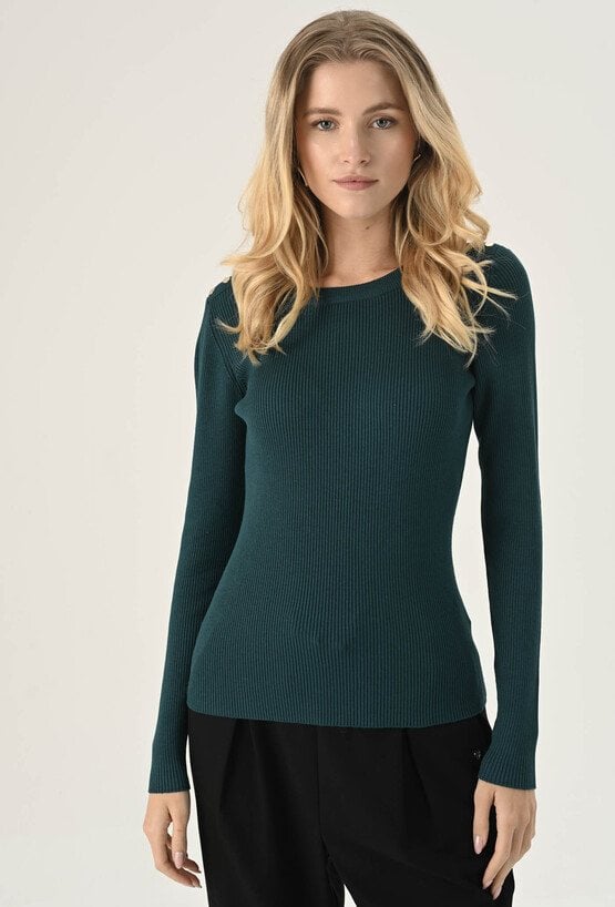 Sweter w kolorze ciemnej zieleni z półokrągłym dekoltem i długimi rękawami. Wykonany z przyjemnej w dotyku wiskozy, zachwyca komfortem noszenia. Charakteru dodaje mu struktura w prążek. Model dostępny jest w kilku wariantach kolorystycznych. To uniwersalna propozycja, która świetnie sprawdzi się w wielu stylizacjach. Modelka na zdjęciu ma 177 cm wzrostu i prezentuje rozmiar S.