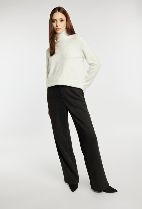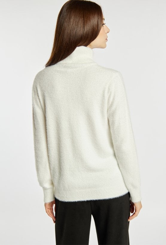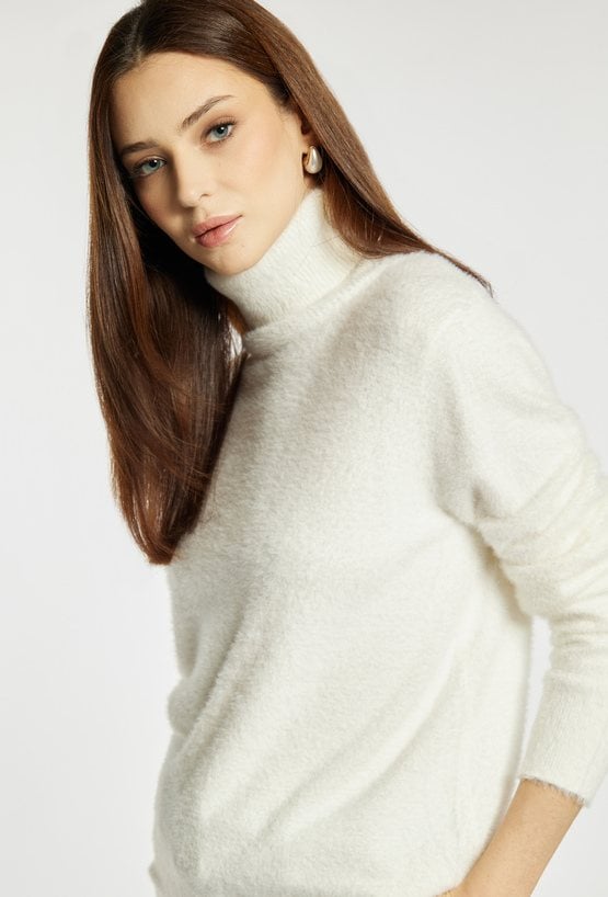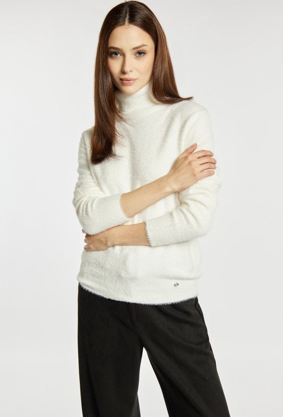 Golf damski wykonany z przyjemnego w dotyku materiale. Golf z długimi rękawami to elegancki, ciepły model idealny na chłodniejsze dni. Modelka na zdjęciu ma 177 cm wzrostu i prezentuje rozmiar S/M.