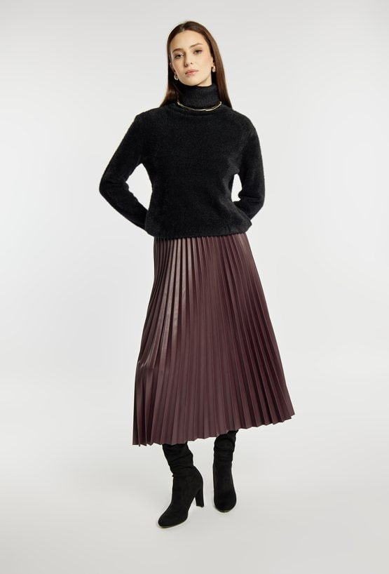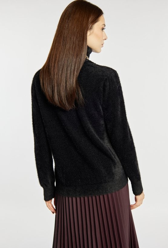 Golf damski wykonany z przyjemnego w dotyku materiale. Golf z długimi rękawami to elegancki, ciepły model idealny na chłodniejsze dni. Modelka na zdjęciu ma 177 cm wzrostu i prezentuje rozmiar S/M.