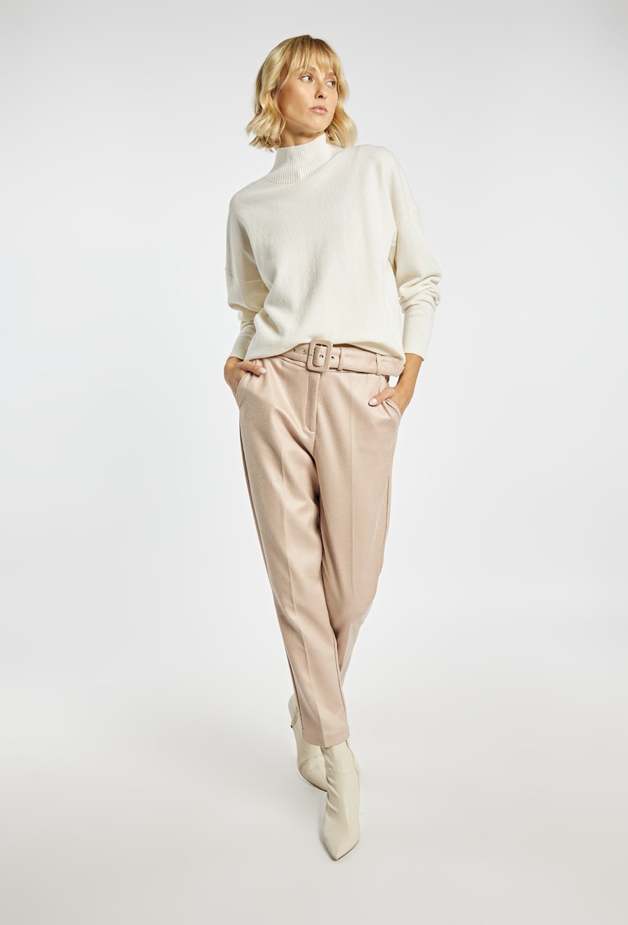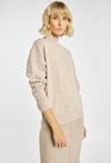 Sweter damski z dodatkiem kaszmiru, zachwycający miękkością i eleganckim wyglądem. Klasyczny fason z półgolfem zapewnia komfort i ciepło w chłodniejsze dni. Modelka na zdjęciu ma 177 cm wzrostu i prezentuje rozmiar S.