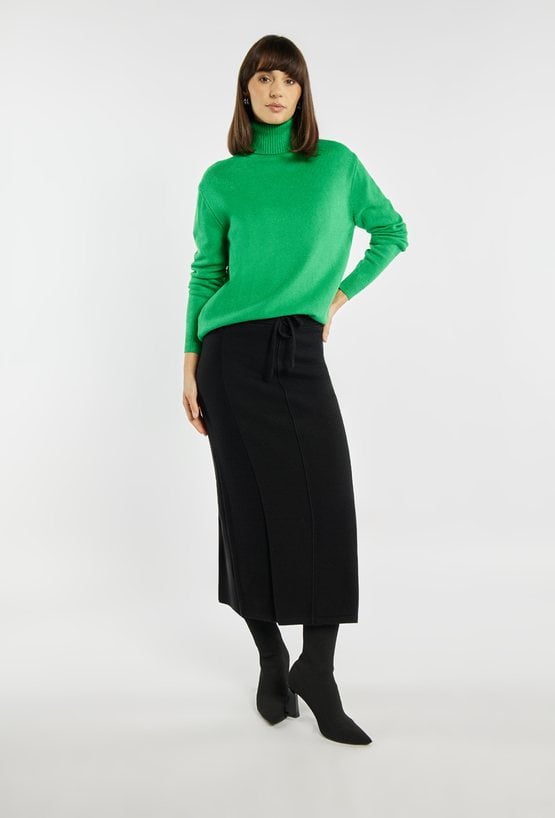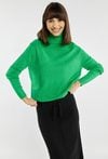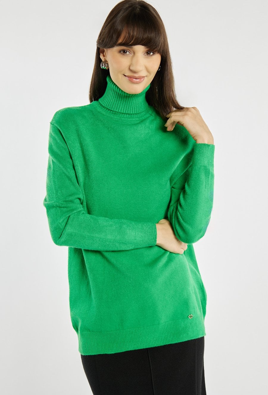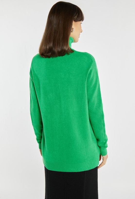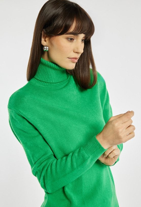 Klasyczny damski sweter z golfem, uszyty z miękkiego, przyjemnego w dotyku materiału. Długie rękawy i dostępność w kilku kolorach sprawiają, że to uniwersalny wybór na chłodniejsze dni. Świetnie uzupełni zarówno codzienne, jak i bardziej eleganckie stylizacje. Modelka na zdjęciu ma 177 cm wzrostu i prezentuje rozmiar S/M.