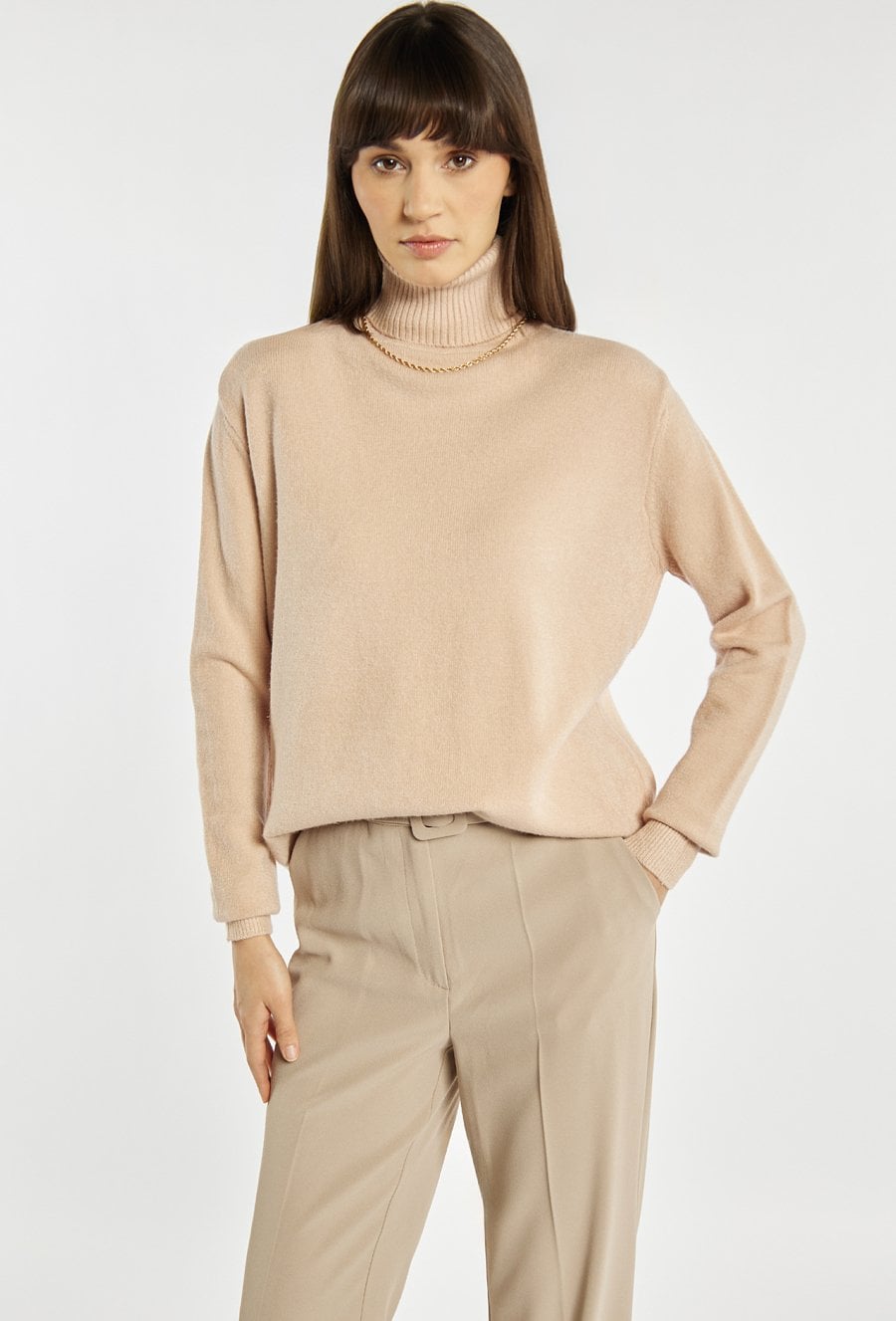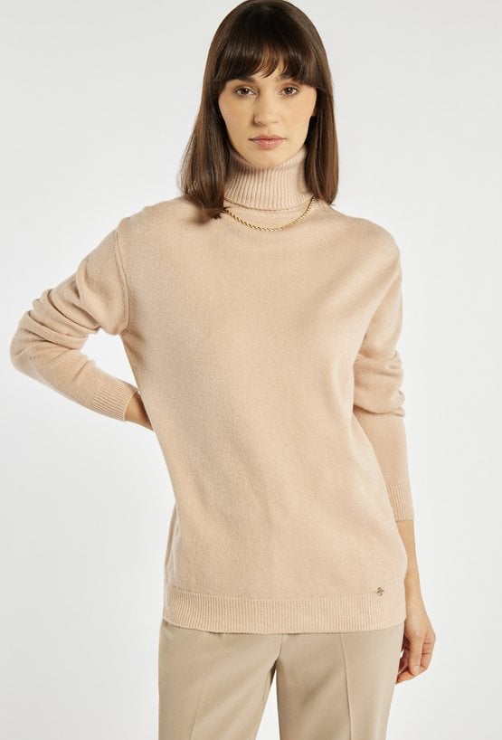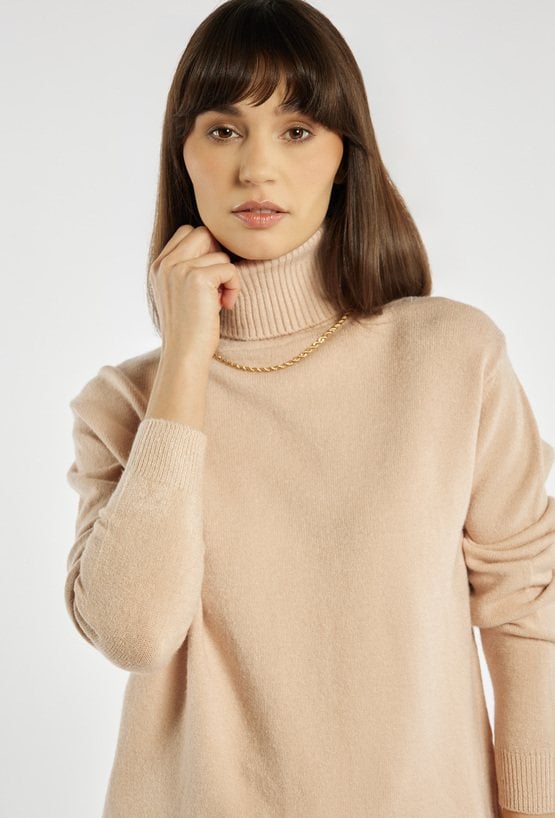Klasyczny damski sweter z golfem, uszyty z miękkiego, przyjemnego w dotyku materiału. Długie rękawy i dostępność w kilku kolorach sprawiają, że to uniwersalny wybór na chłodniejsze dni. Świetnie uzupełni zarówno codzienne, jak i bardziej eleganckie stylizacje. Modelka na zdjęciu ma 177 cm wzrostu i prezentuje rozmiar S/M.