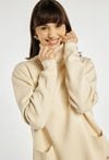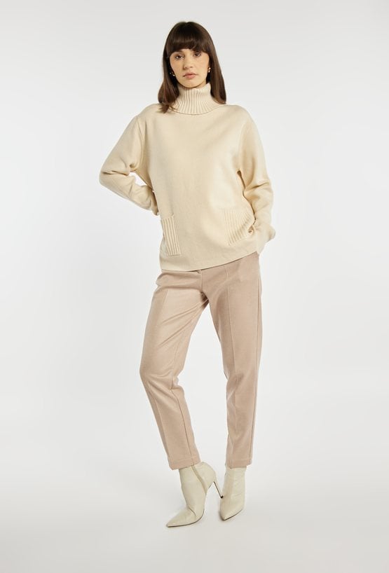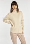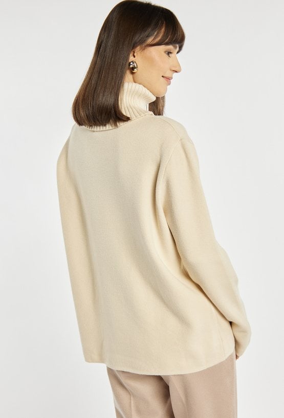 Luźny sweter damski z praktycznymi kieszonkami, idealny na chłodniejsze dni. Sweter z długimi rękawami i golfem zapewnia ciepło oraz wygodę, tworząc świetną bazę zimowych stylizacji. Modelka na zdjęciu ma 177 cm wzrostu i prezentuje rozmiar S/M.