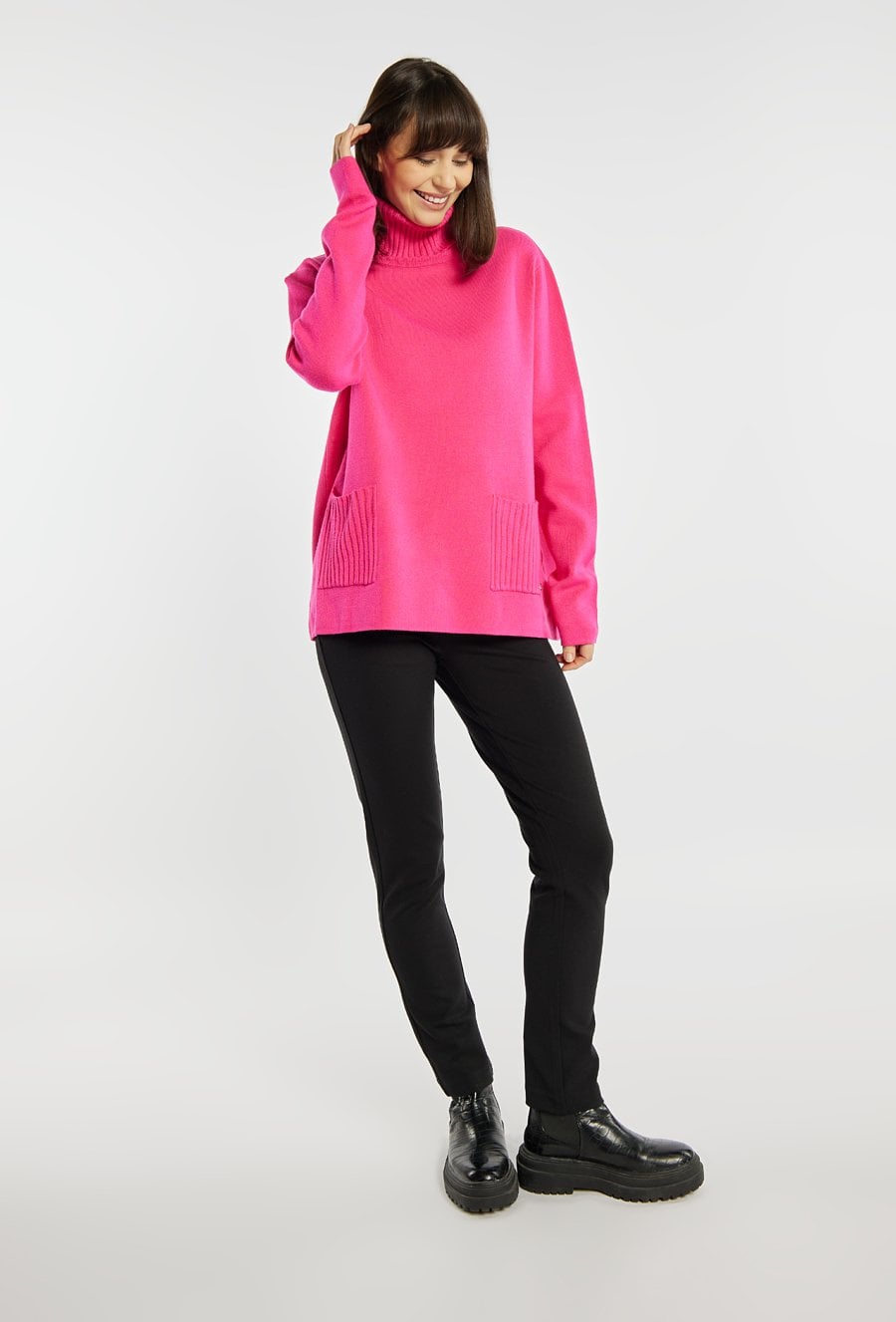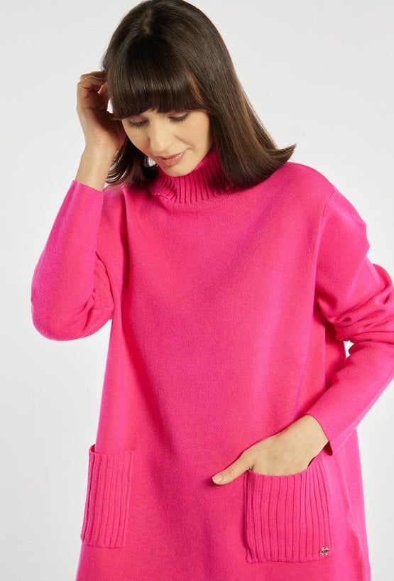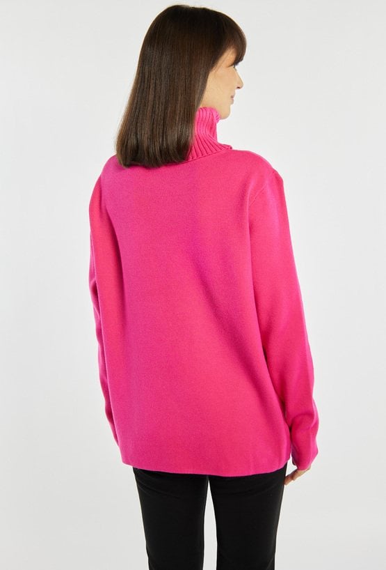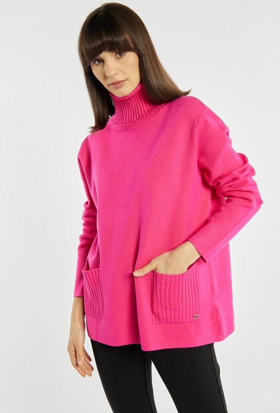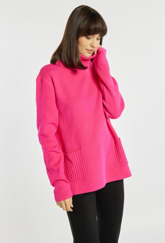 Luźny sweter damski z praktycznymi kieszonkami, idealny na chłodniejsze dni. Sweter z długimi rękawami i golfem zapewnia ciepło oraz wygodę, tworząc świetną bazę zimowych stylizacji. Modelka na zdjęciu ma 177 cm wzrostu i prezentuje rozmiar S/M.