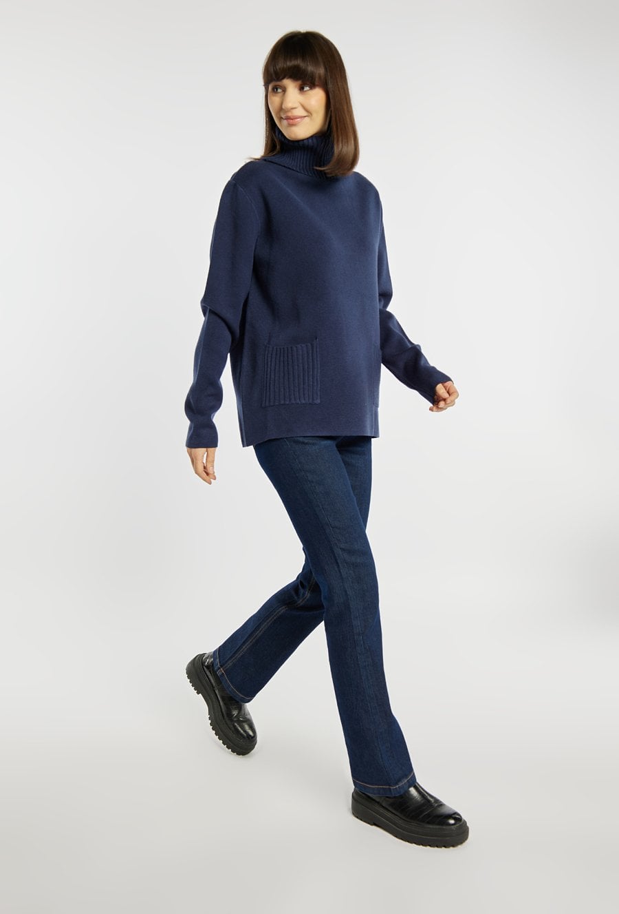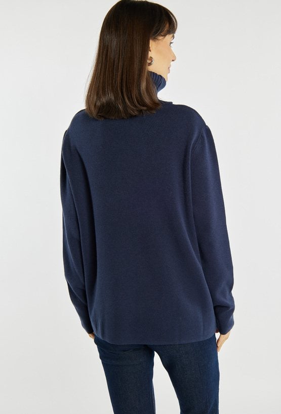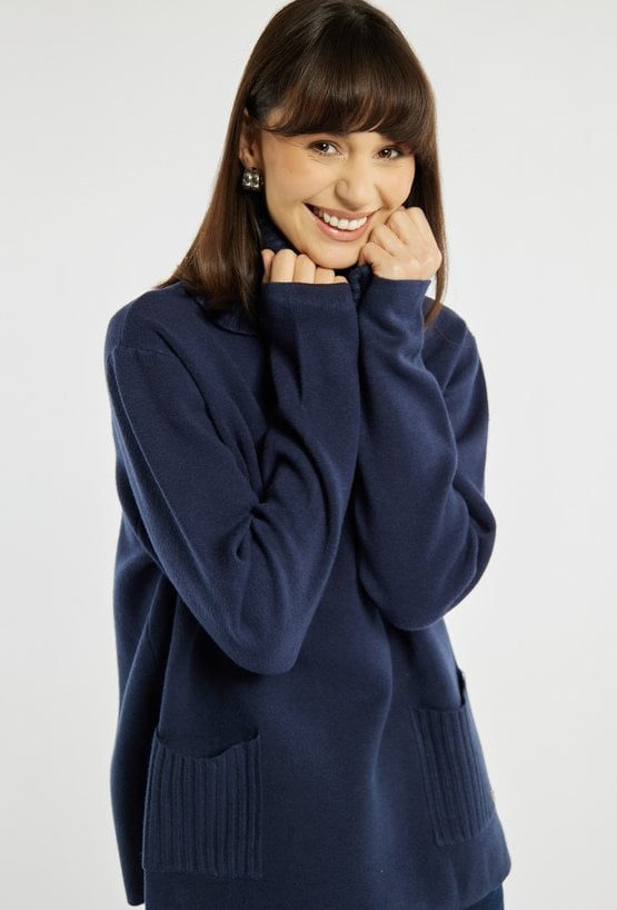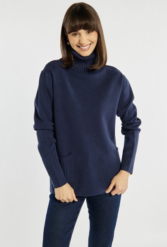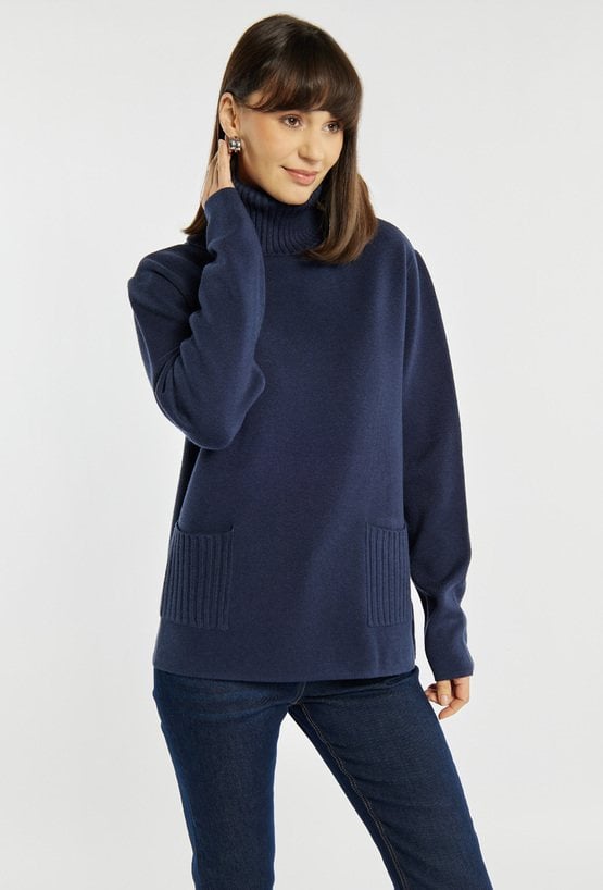 Luźny sweter damski z praktycznymi kieszonkami, idealny na chłodniejsze dni. Sweter z długimi rękawami i golfem zapewnia ciepło oraz wygodę, tworząc świetną bazę zimowych stylizacji. Modelka na zdjęciu ma 177 cm wzrostu i prezentuje rozmiar S/M.