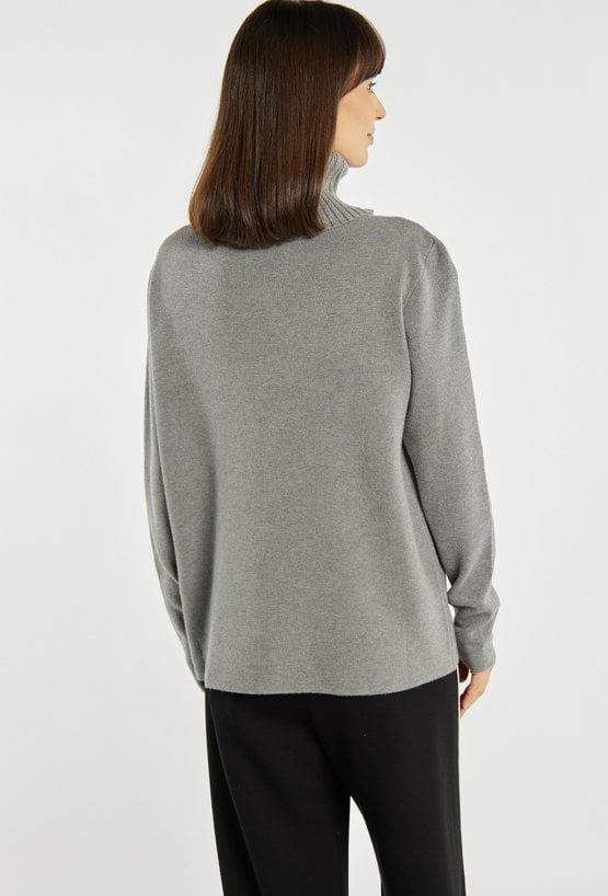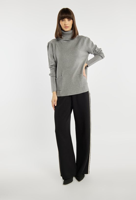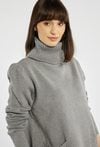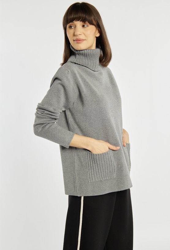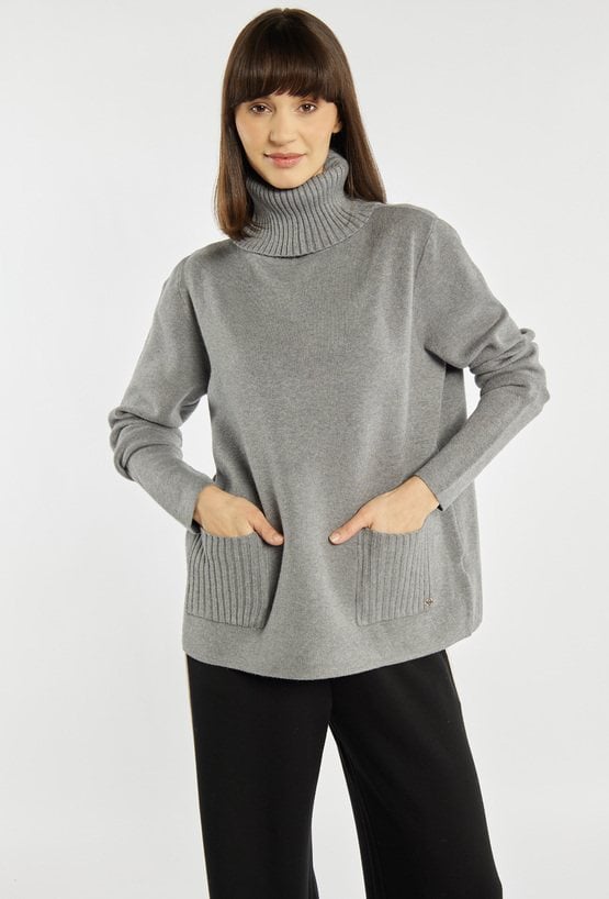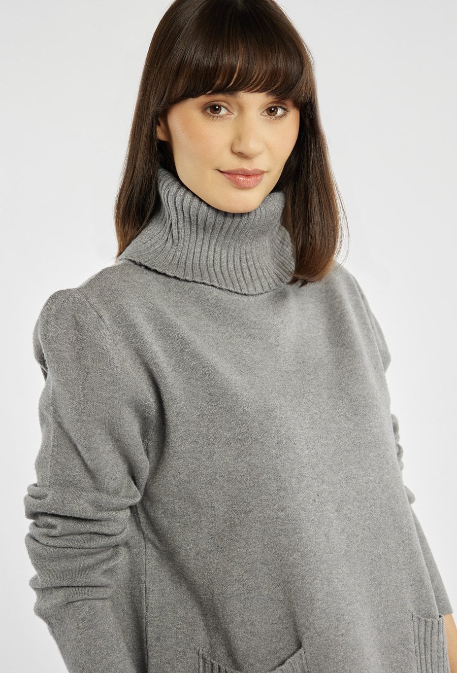 Luźny sweter damski z praktycznymi kieszonkami, idealny na chłodniejsze dni. Sweter z długimi rękawami i golfem zapewnia ciepło oraz wygodę, tworząc świetną bazę zimowych stylizacji. Modelka na zdjęciu ma 177 cm wzrostu i prezentuje rozmiar S/M.
