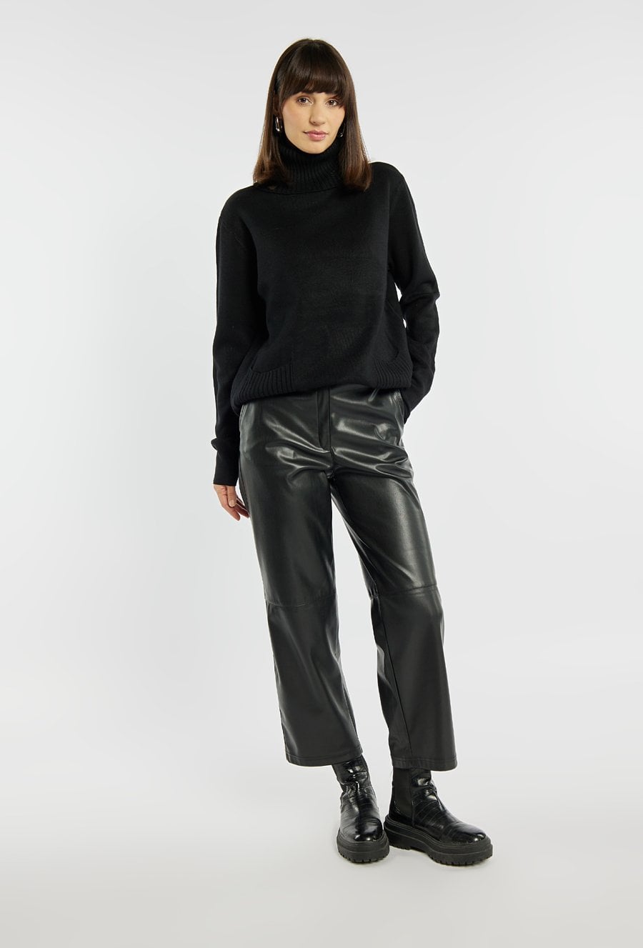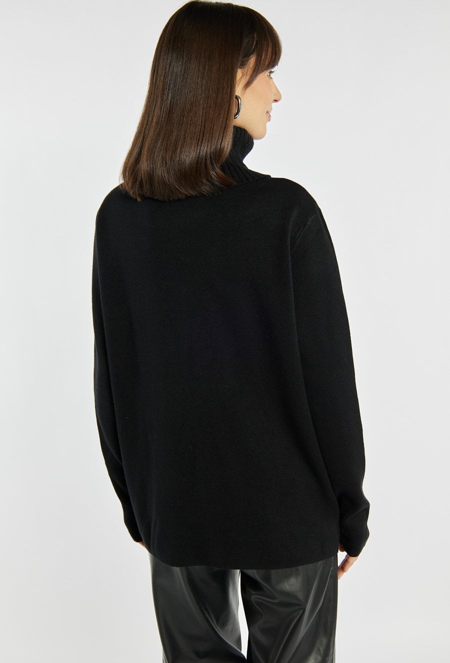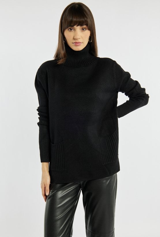 Luźny sweter damski z praktycznymi kieszonkami, idealny na chłodniejsze dni. Sweter z długimi rękawami i golfem zapewnia ciepło oraz wygodę, tworząc świetną bazę zimowych stylizacji. Modelka na zdjęciu ma 177 cm wzrostu i prezentuje rozmiar S/M.