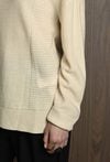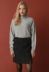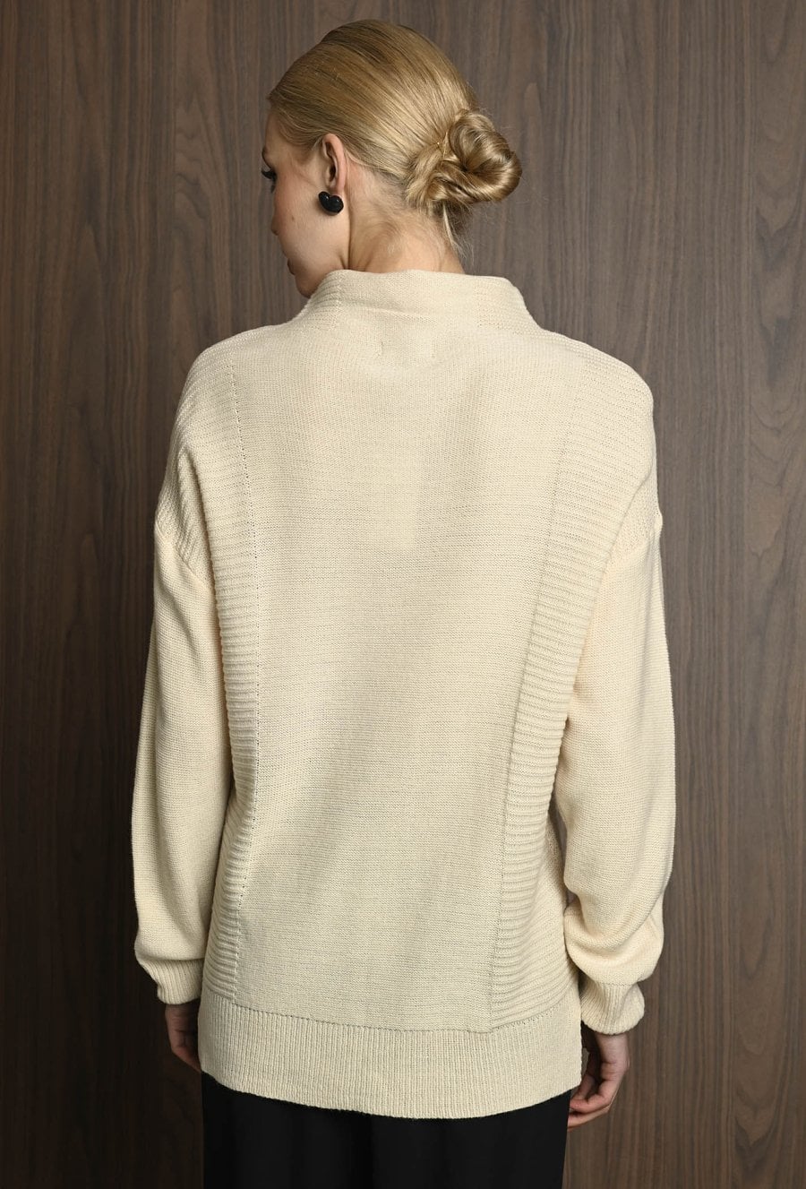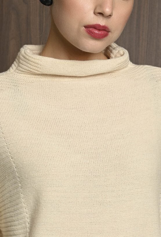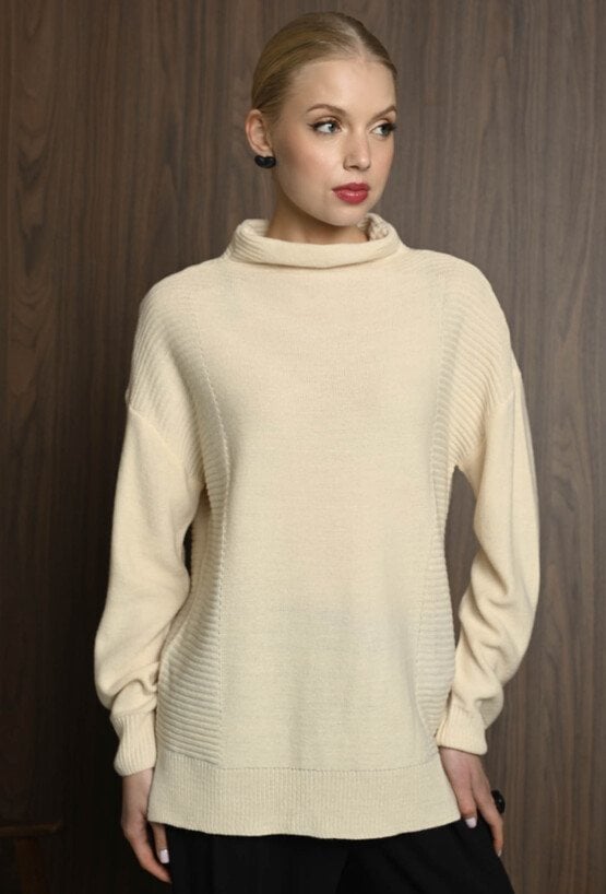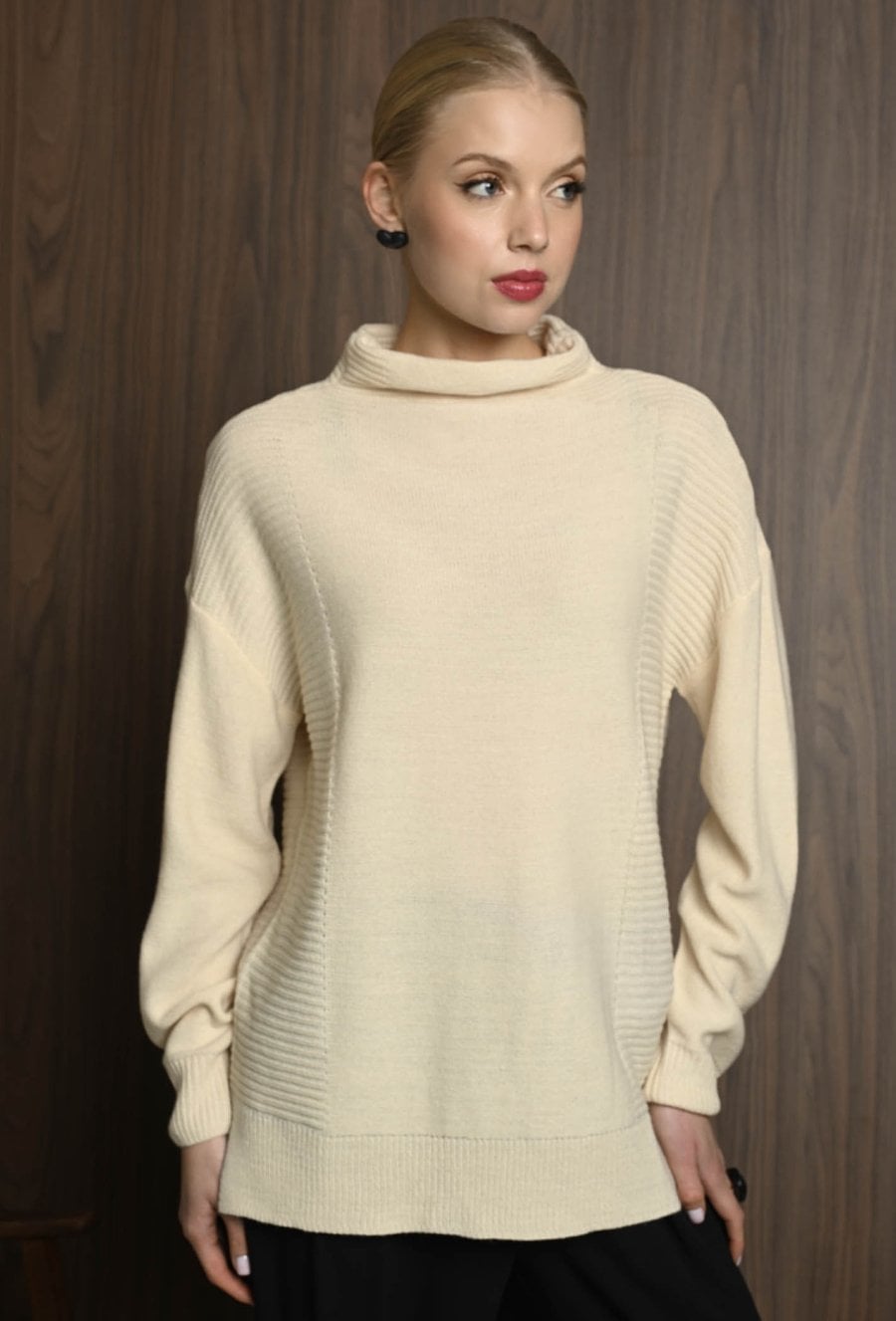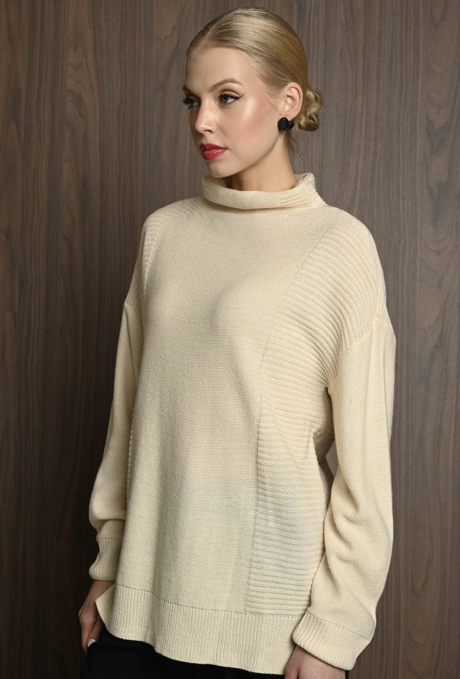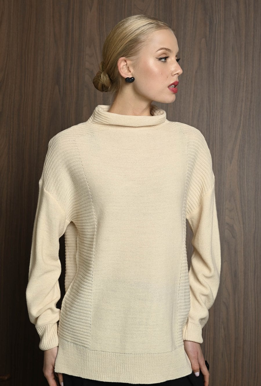 Stylowy sweter z miękkiej dzianiny z domieszką wełny. Lekko oversize'owy fason zapewnia wygodę i swobodę ruchów. Efektowne dzianie po bokach dodaje charakteru, a wysoki golf pięknie układa się wokół szyi, nadając całości szykownego wyglądu. Idealny na chłodne dni – do jeansów, spódnicy czy eleganckich spodni. Modelka na zdjęciu ma 177 cm wzrostu i prezentuje rozmiar 36.