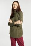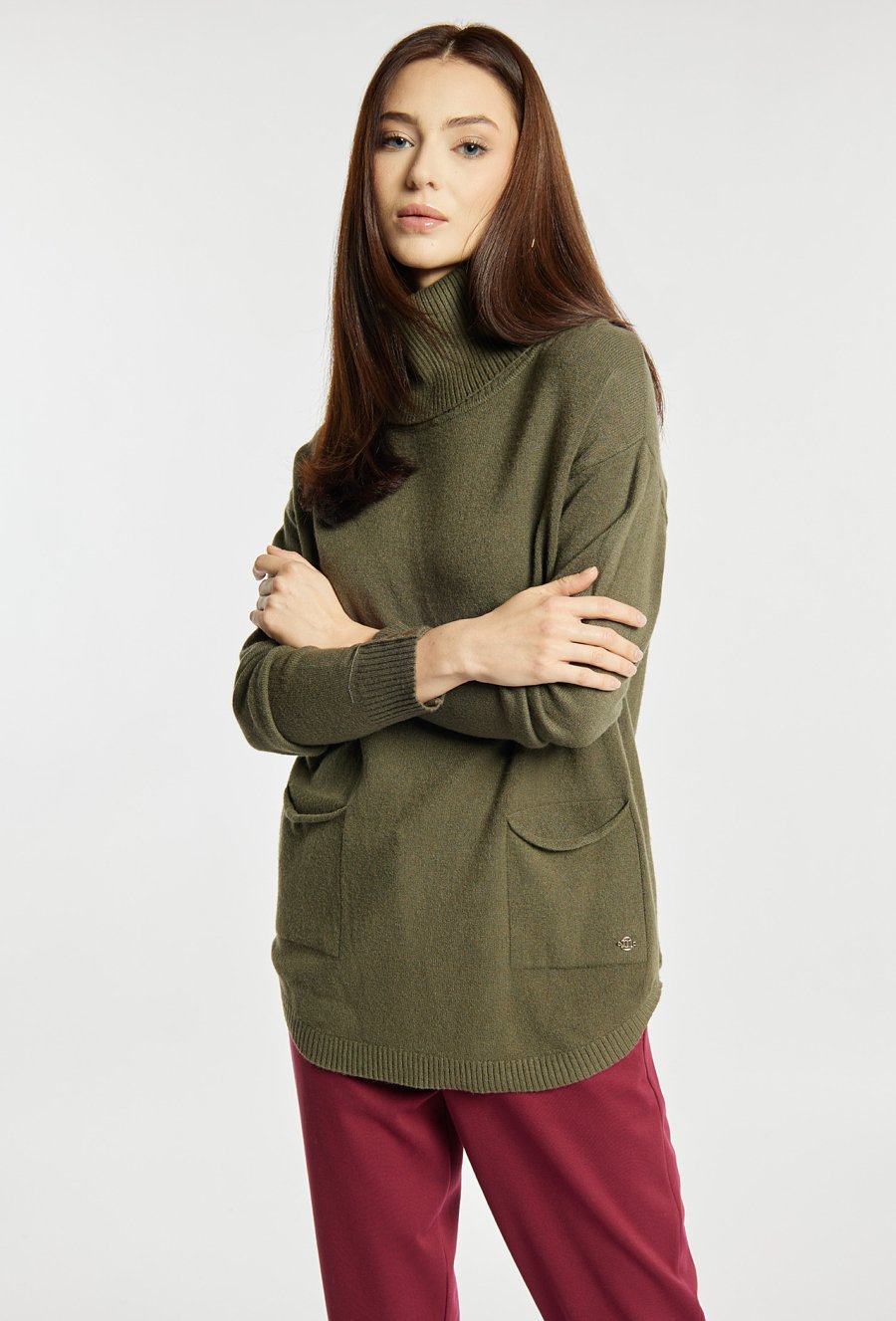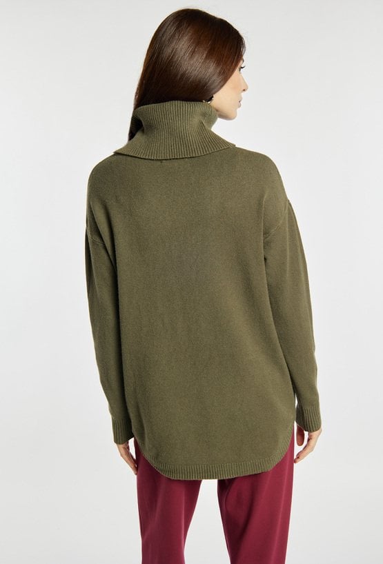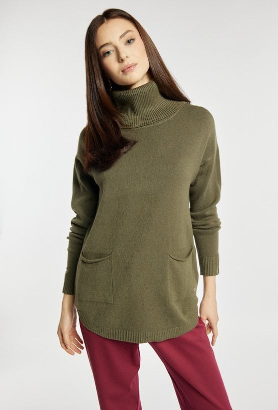 Sweter damski wykonany z dodatkiem wiskozy, dzięki czemu jest miękki i przyjemny w dotyku. Model z luźnym golfem i długimi rękawami, zapewniający komfort i swobodę noszenia. Sweter dostępny jest w kilku wariantach kolorystycznych, co pozwala dopasować go do różnych stylizacji. Modelka na zdjęciu ma 177 cm wzrostu i prezentuje rozmiar S/M.