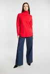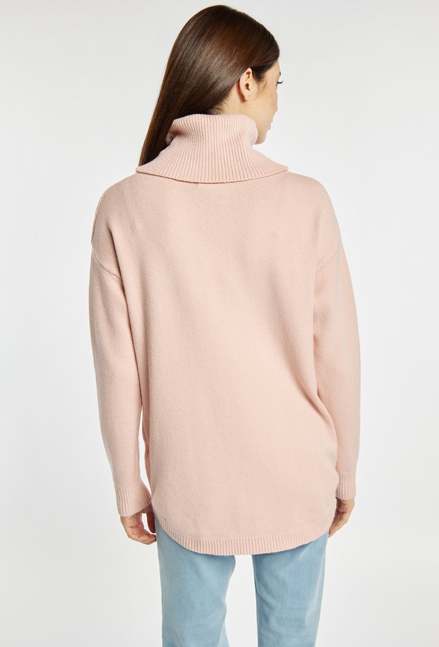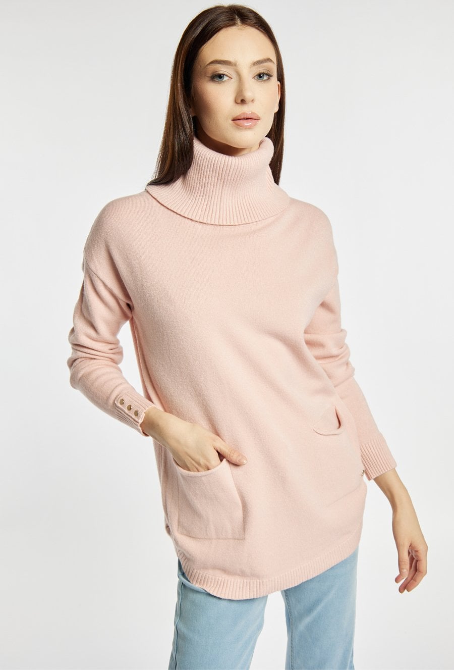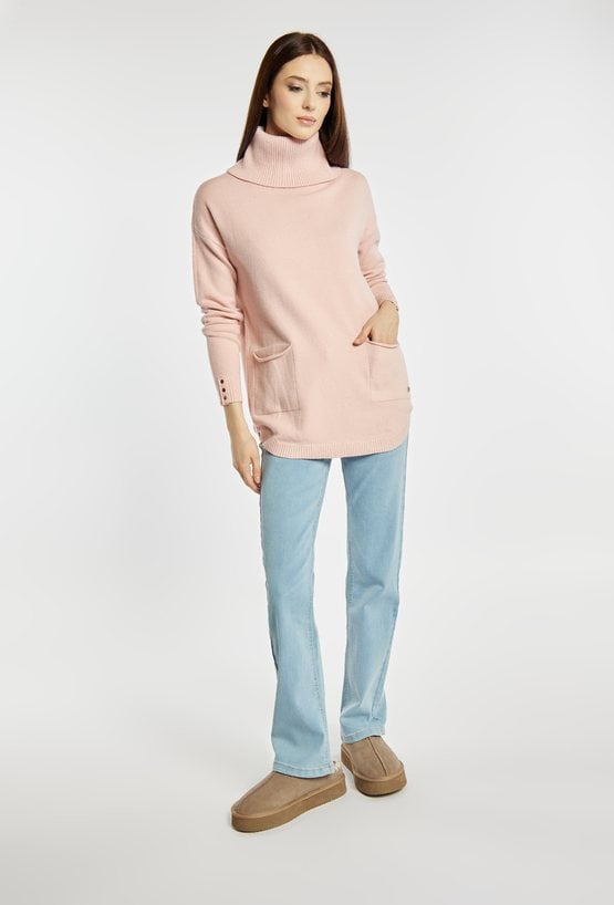 Sweter damski wykonany z dodatkiem wiskozy, dzięki czemu jest miękki i przyjemny w dotyku. Model z luźnym golfem i długimi rękawami, zapewniający komfort i swobodę noszenia. Sweter dostępny jest w kilku wariantach kolorystycznych, co pozwala dopasować go do różnych stylizacji. Modelka na zdjęciu ma 177 cm wzrostu i prezentuje rozmiar S/M.