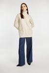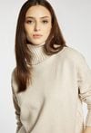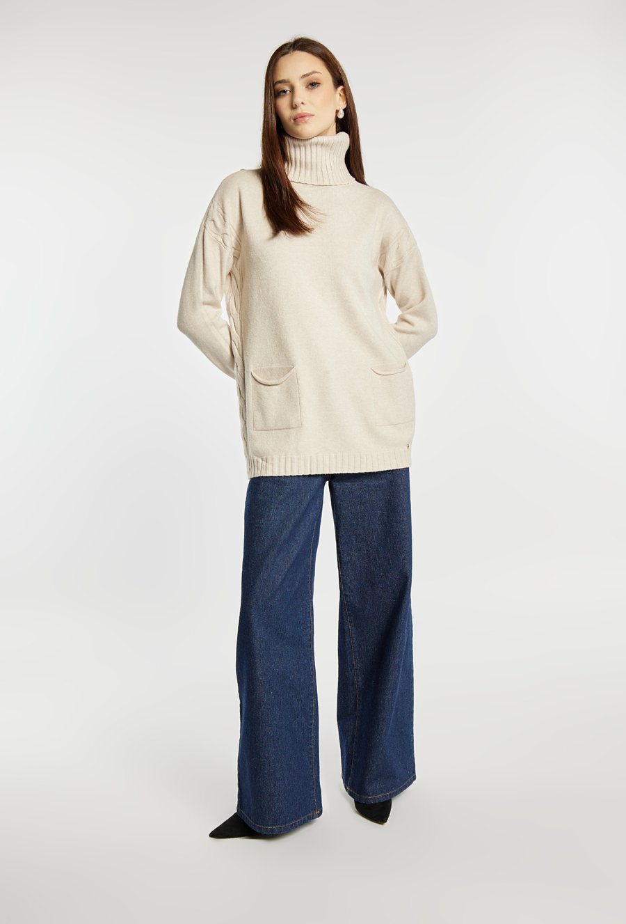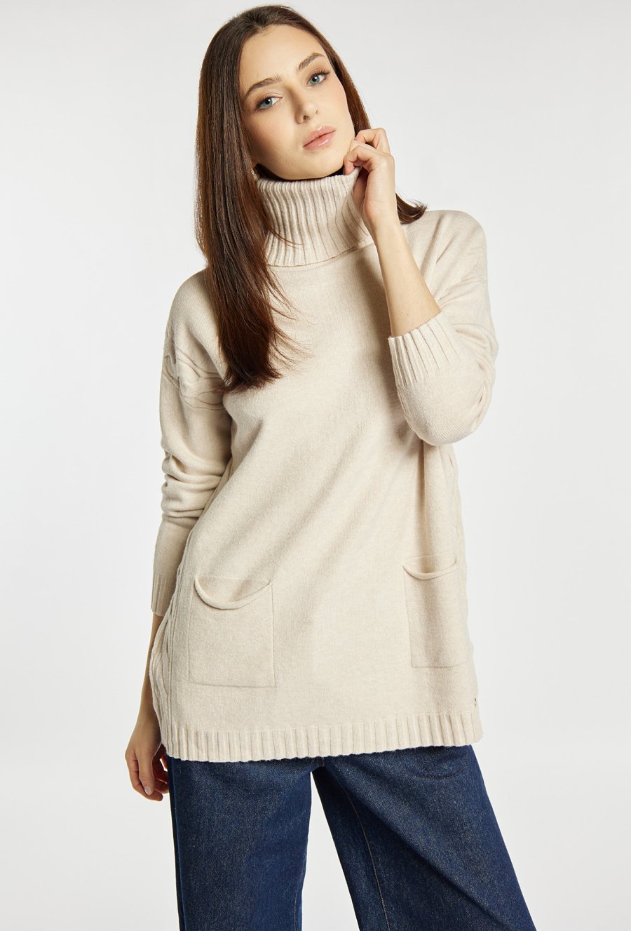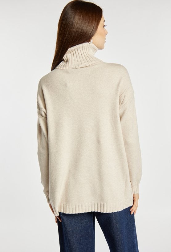 Sweter z długimi rękawami i wysokim golfem to ciepły, miękki model idealny na chłodniejsze dni. Sweter ma dłuższy, luźny fason, praktyczne kieszenie z przodu oraz szerokie, prążkowane wykończenia, które nadają mu przytulny i stylowy charakter. Modelka na zdjęciu ma 177 cm wzrostu i prezentuje rozmiar S/M.