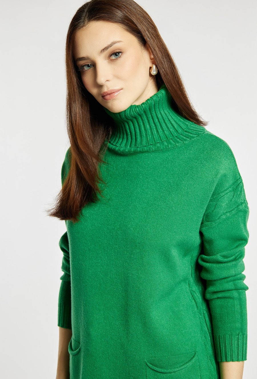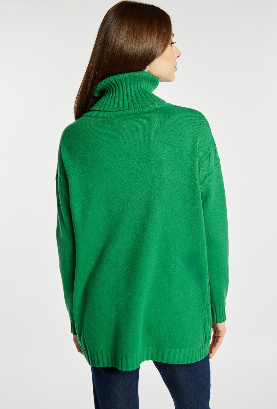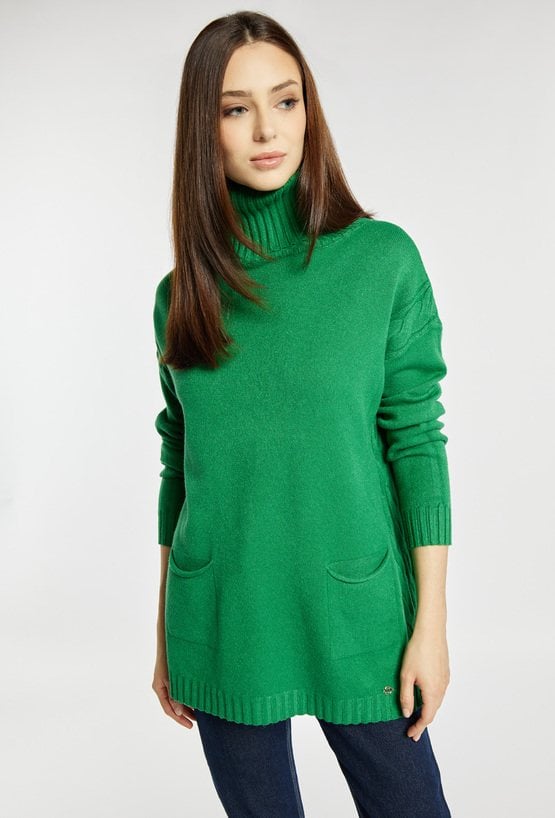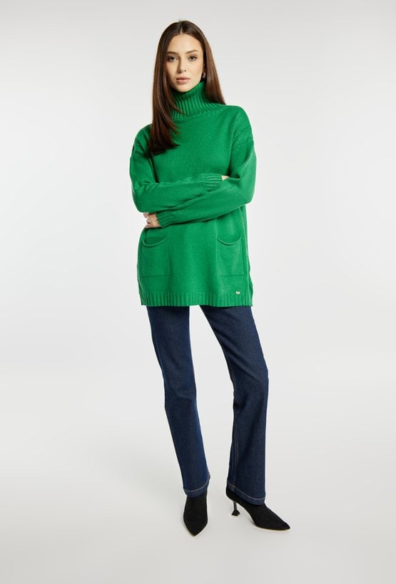 Sweter z długimi rękawami i wysokim golfem to ciepły, miękki model idealny na chłodniejsze dni. Sweter ma dłuższy, luźny fason, praktyczne kieszenie z przodu oraz szerokie, prążkowane wykończenia, które nadają mu przytulny i stylowy charakter. Modelka na zdjęciu ma 177 cm wzrostu i prezentuje rozmiar S/M.