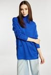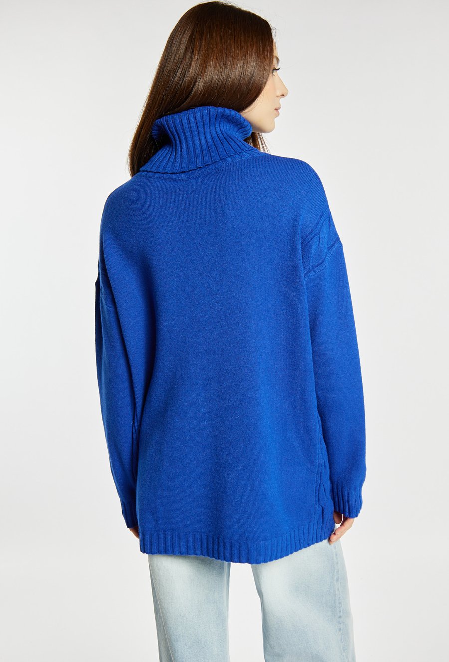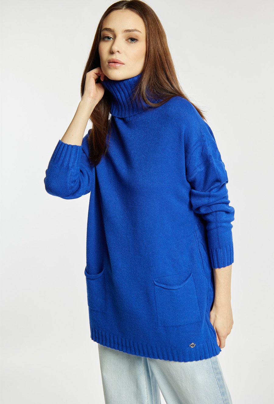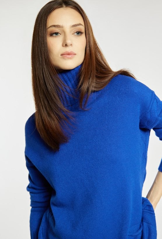 Sweter z długimi rękawami i wysokim golfem to ciepły, miękki model idealny na chłodniejsze dni. Sweter ma dłuższy, luźny fason, praktyczne kieszenie z przodu oraz szerokie, prążkowane wykończenia, które nadają mu przytulny i stylowy charakter. Modelka na zdjęciu ma 177 cm wzrostu i prezentuje rozmiar S/M.