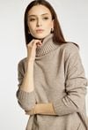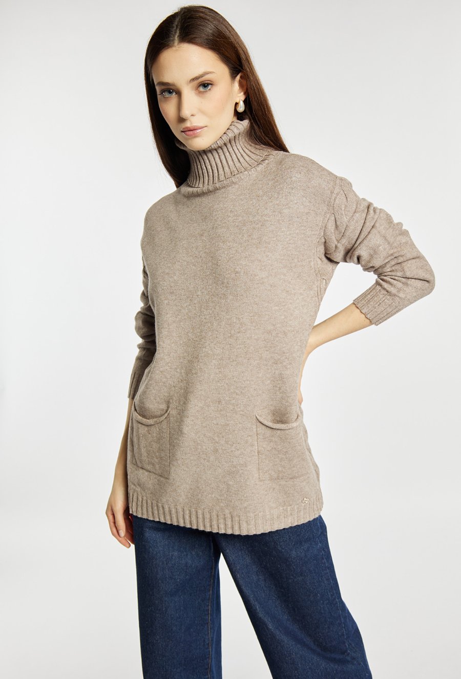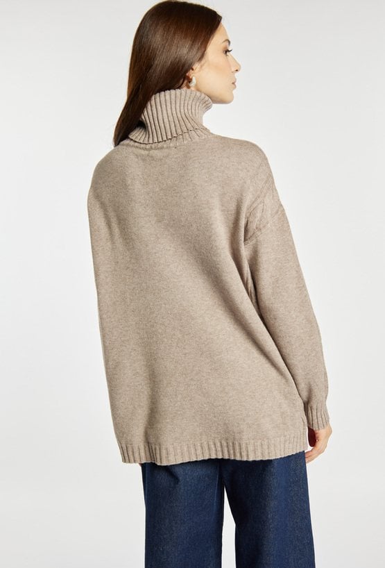 Sweter z długimi rękawami i wysokim golfem to ciepły, miękki model idealny na chłodniejsze dni. Sweter ma dłuższy, luźny fason, praktyczne kieszenie z przodu oraz szerokie, prążkowane wykończenia, które nadają mu przytulny i stylowy charakter. Modelka na zdjęciu ma 177 cm wzrostu i prezentuje rozmiar S/M.
