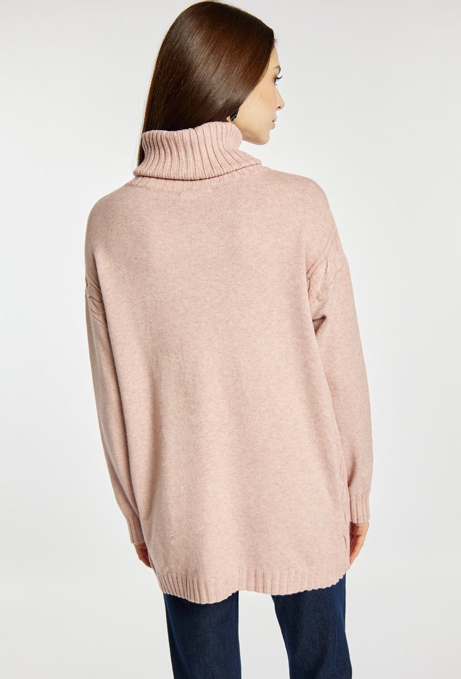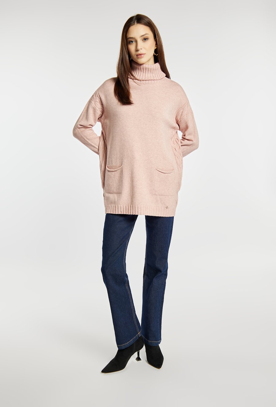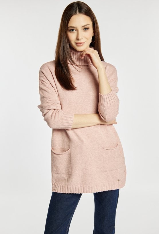 Sweter z długimi rękawami i wysokim golfem to ciepły, miękki model idealny na chłodniejsze dni. Sweter ma dłuższy, luźny fason, praktyczne kieszenie z przodu oraz szerokie, prążkowane wykończenia, które nadają mu przytulny i stylowy charakter. Modelka na zdjęciu ma 177 cm wzrostu i prezentuje rozmiar S/M.