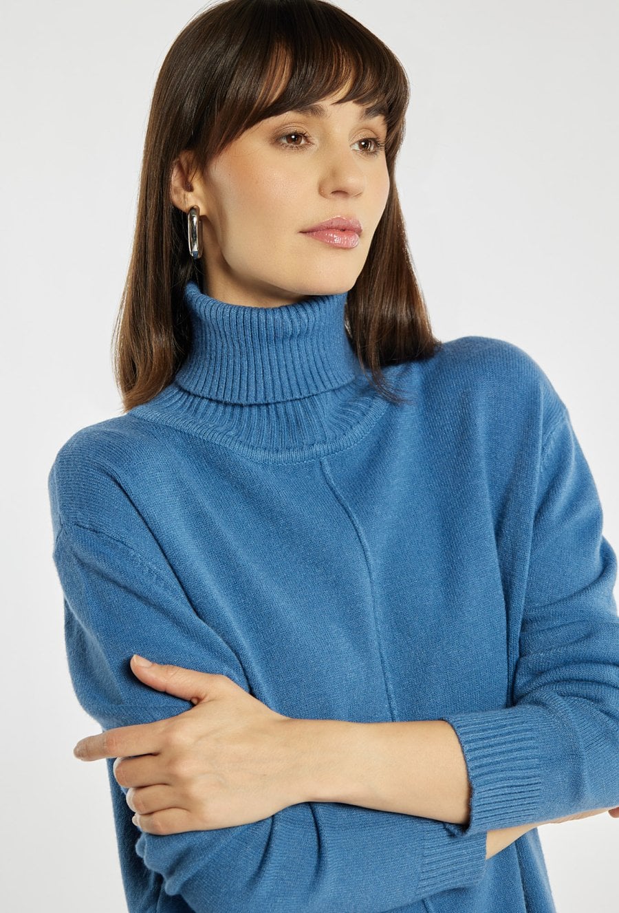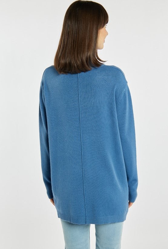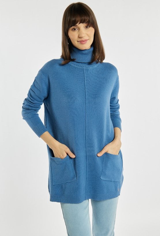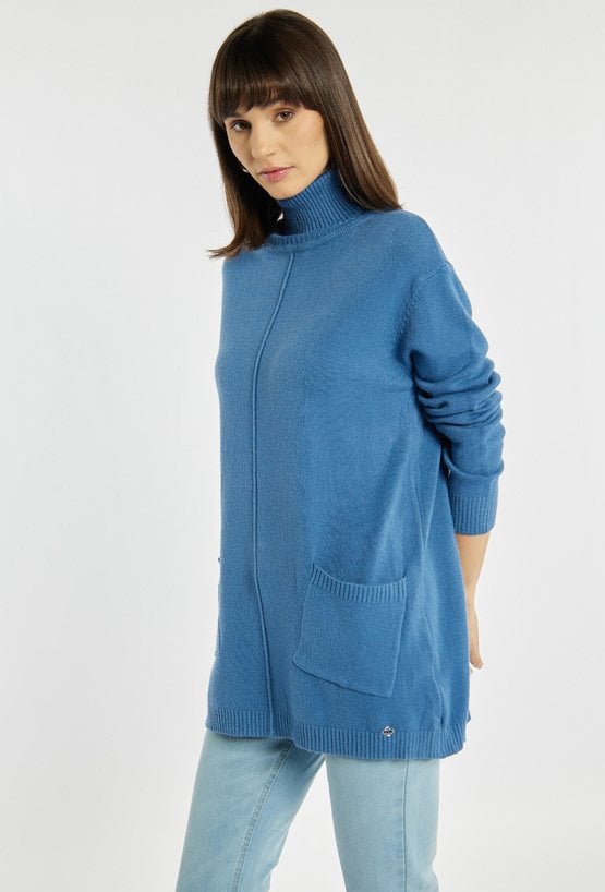 Sweter damski wykonany z przyjemnego w dotyku materiału. Sweter z długimi rękawami i golfem doskonale sprawdzi się w zimowe dni, zapewniając ciepło i komfort. Model dostępny jest w wielu wariantach kolorystycznych, co ułatwia dopasowanie go do własnego stylu. Modelka na zdjęciu ma 177 cm wzrostu i prezentuje rozmiar S/M.