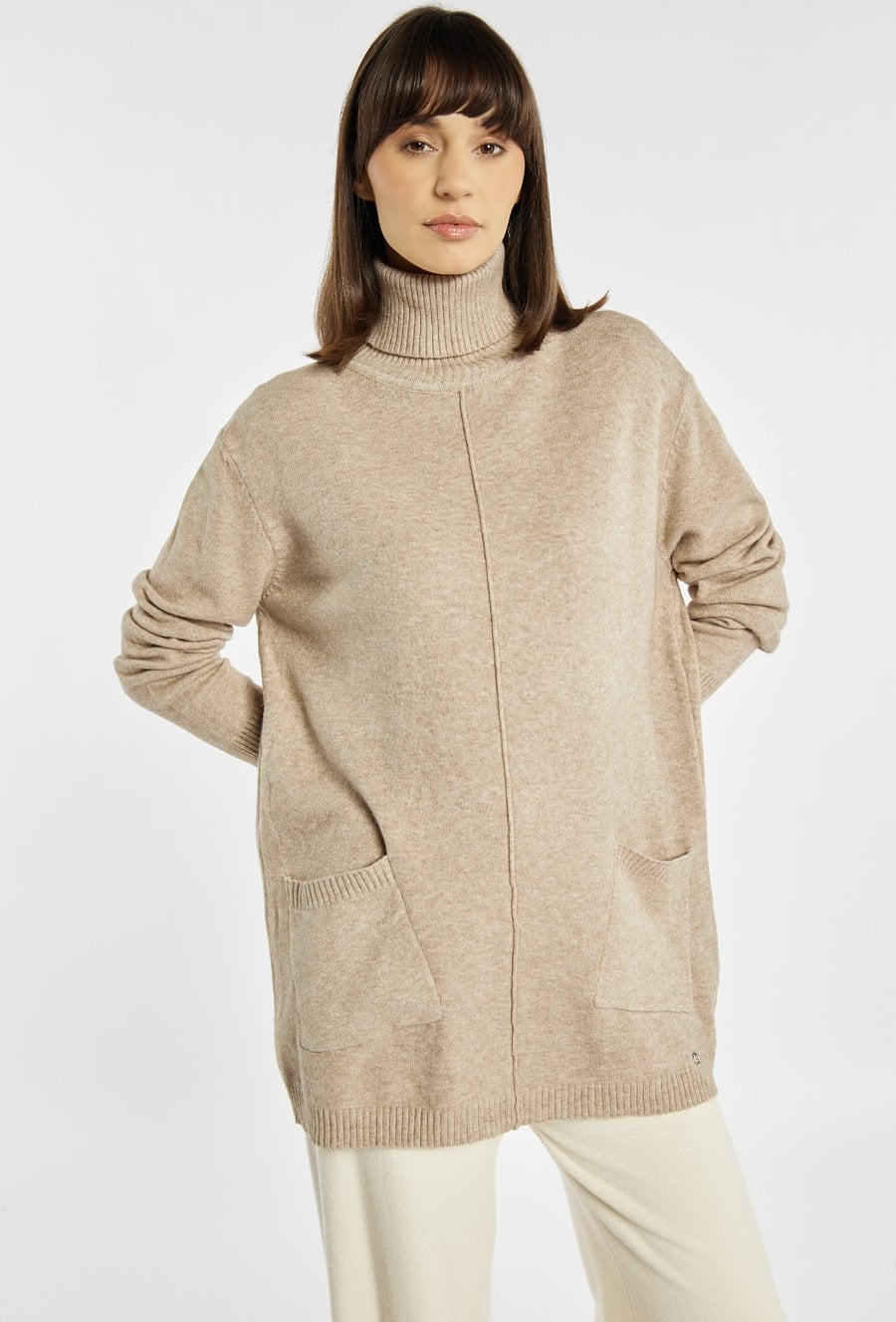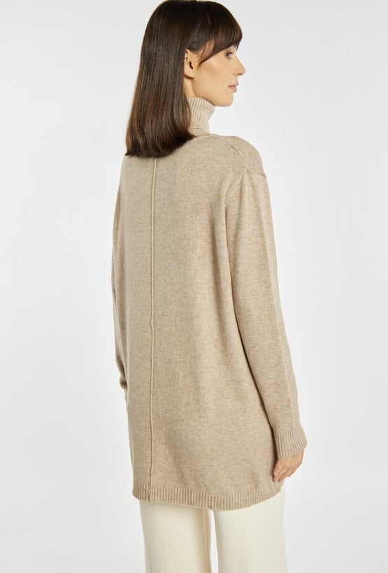 Sweter damski wykonany z przyjemnego w dotyku materiału. Sweter z długimi rękawami i golfem doskonale sprawdzi się w zimowe dni, zapewniając ciepło i komfort. Model dostępny jest w wielu wariantach kolorystycznych, co ułatwia dopasowanie go do własnego stylu. Modelka na zdjęciu ma 177 cm wzrostu i prezentuje rozmiar S/M.