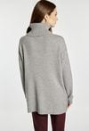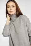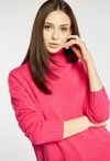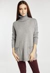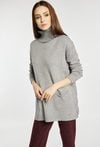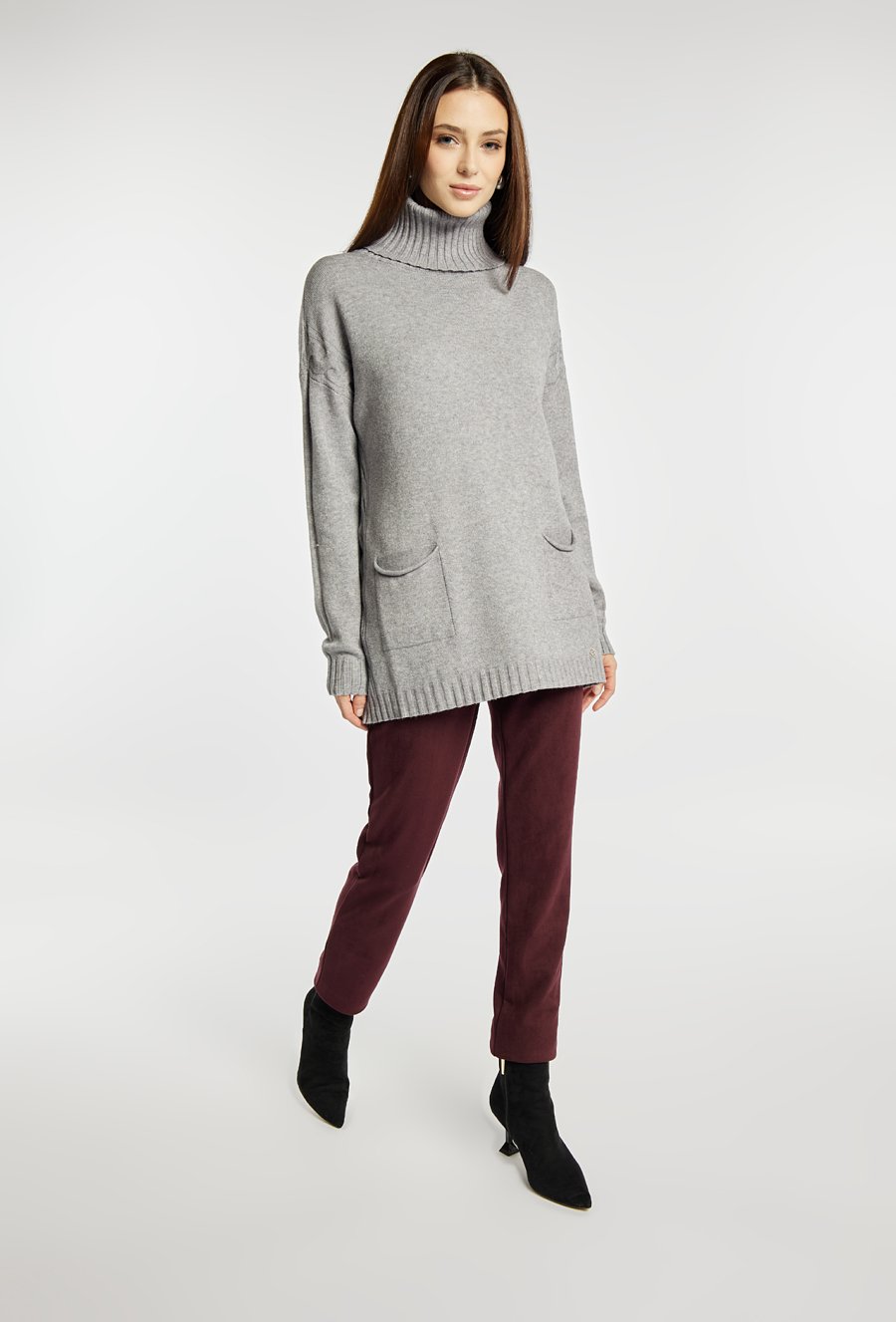 Sweter z długimi rękawami i wysokim golfem to ciepły, miękki model idealny na chłodniejsze dni. Sweter ma dłuższy, luźny fason, praktyczne kieszenie z przodu oraz szerokie, prążkowane wykończenia, które nadają mu przytulny i stylowy charakter. Modelka na zdjęciu ma 177 cm wzrostu i prezentuje rozmiar S/M.
