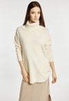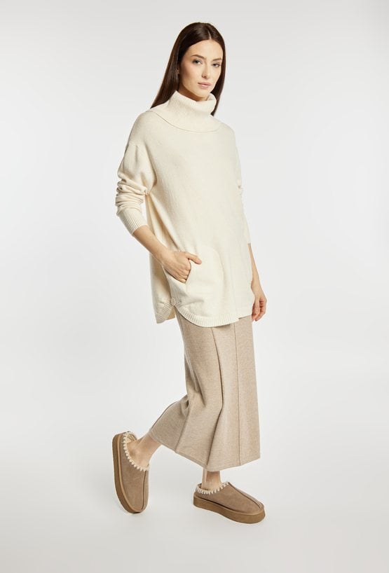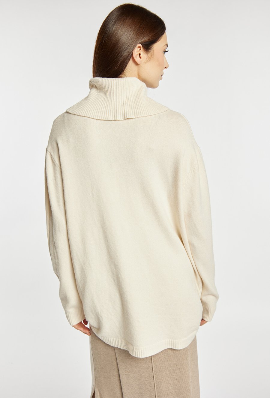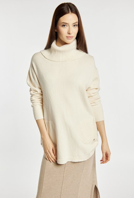 Luźny sweter damski z golfem, idealny na chłodniejsze dni. Model z długimi rękawami, kieszonkami oraz ozdobnymi guzikami po bokach, które nadają mu wyjątkowego charakteru. Sweter dostępny w kilku wariantach kolorystycznych, dzięki czemu łatwo dopasować go do różnych stylizacji. Modelka na zdjęciu ma 177 cm wzrostu i prezentuje rozmiar S/M.