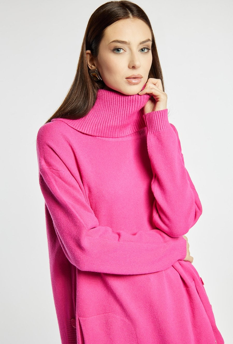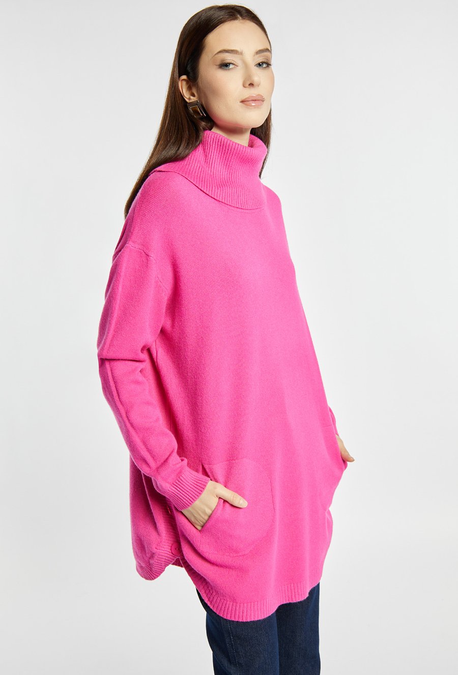 Luźny sweter damski z golfem, idealny na chłodniejsze dni. Model z długimi rękawami, kieszonkami oraz ozdobnymi guzikami po bokach, które nadają mu wyjątkowego charakteru. Sweter dostępny w kilku wariantach kolorystycznych, dzięki czemu łatwo dopasować go do różnych stylizacji. Modelka na zdjęciu ma 177 cm wzrostu i prezentuje rozmiar S/M.