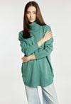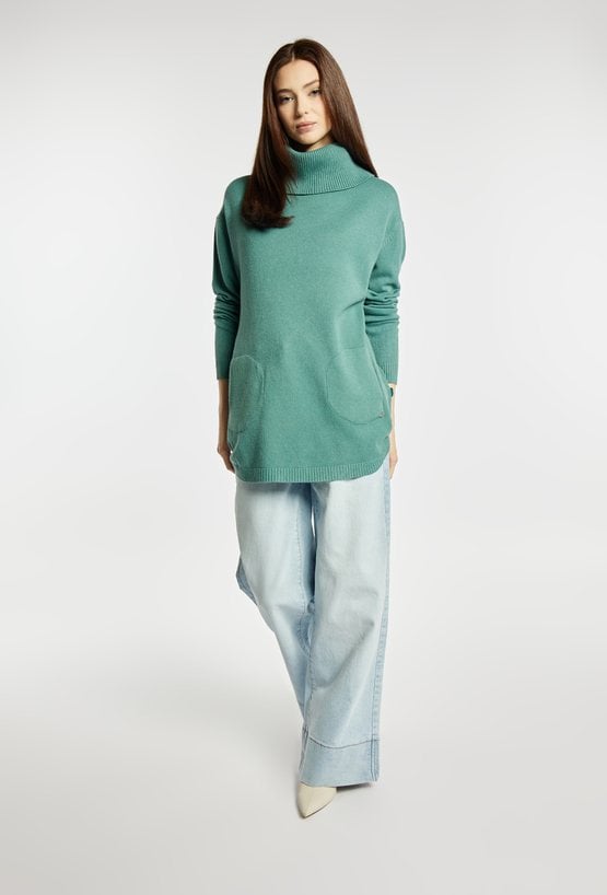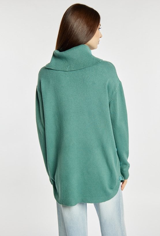 Luźny sweter damski z golfem, idealny na chłodniejsze dni. Model z długimi rękawami, kieszonkami oraz ozdobnymi guzikami po bokach, które nadają mu wyjątkowego charakteru. Sweter dostępny w kilku wariantach kolorystycznych, dzięki czemu łatwo dopasować go do różnych stylizacji. Modelka na zdjęciu ma 177 cm wzrostu i prezentuje rozmiar S/M.