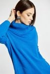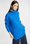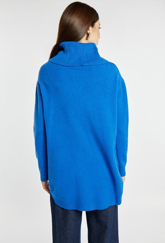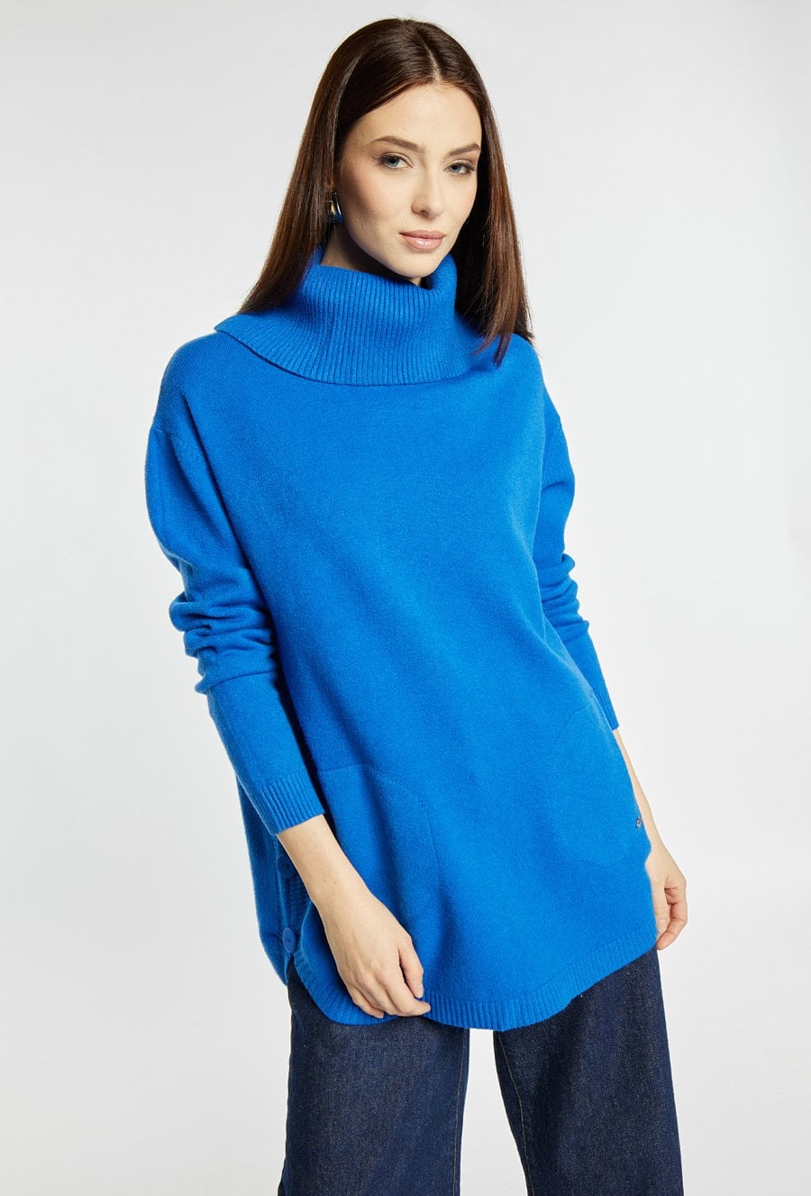 Luźny sweter damski z golfem, idealny na chłodniejsze dni. Model z długimi rękawami, kieszonkami oraz ozdobnymi guzikami po bokach, które nadają mu wyjątkowego charakteru. Sweter dostępny w kilku wariantach kolorystycznych, dzięki czemu łatwo dopasować go do różnych stylizacji. Modelka na zdjęciu ma 177 cm wzrostu i prezentuje rozmiar S/M.