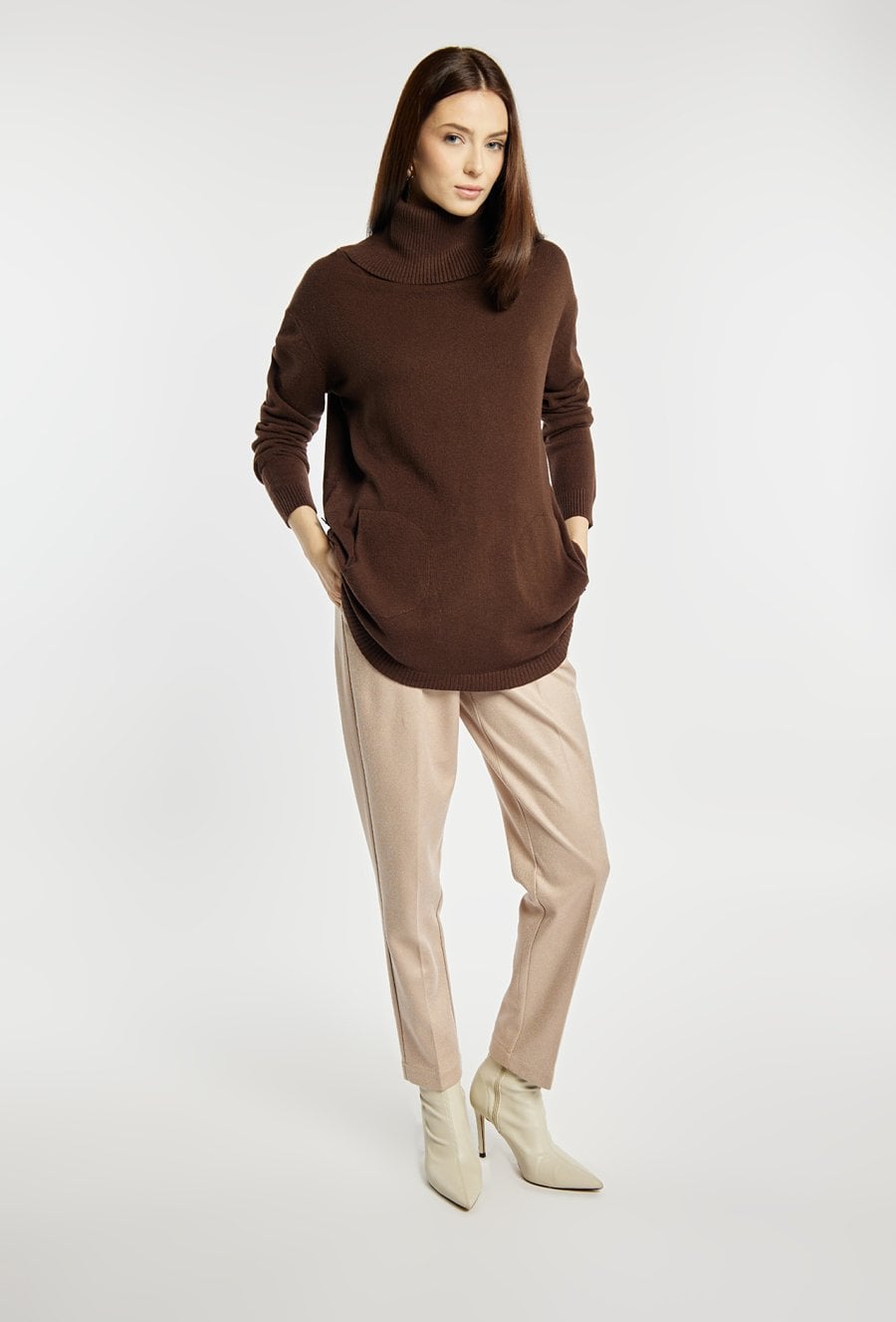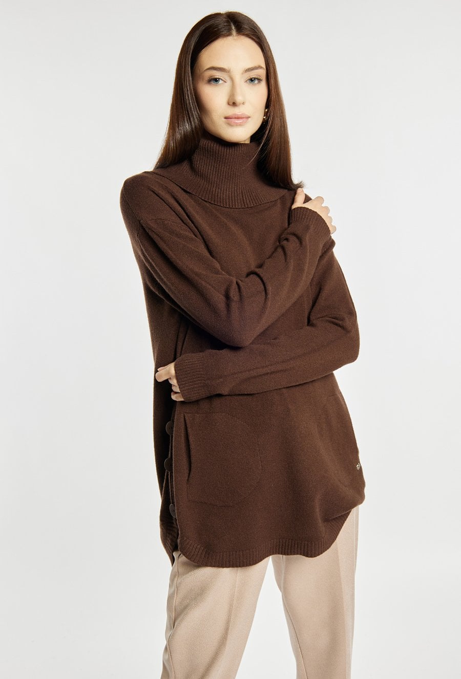Luźny sweter damski z golfem, idealny na chłodniejsze dni. Model z długimi rękawami, kieszonkami oraz ozdobnymi guzikami po bokach, które nadają mu wyjątkowego charakteru. Sweter dostępny w kilku wariantach kolorystycznych, dzięki czemu łatwo dopasować go do różnych stylizacji. Modelka na zdjęciu ma 177 cm wzrostu i prezentuje rozmiar S/M.