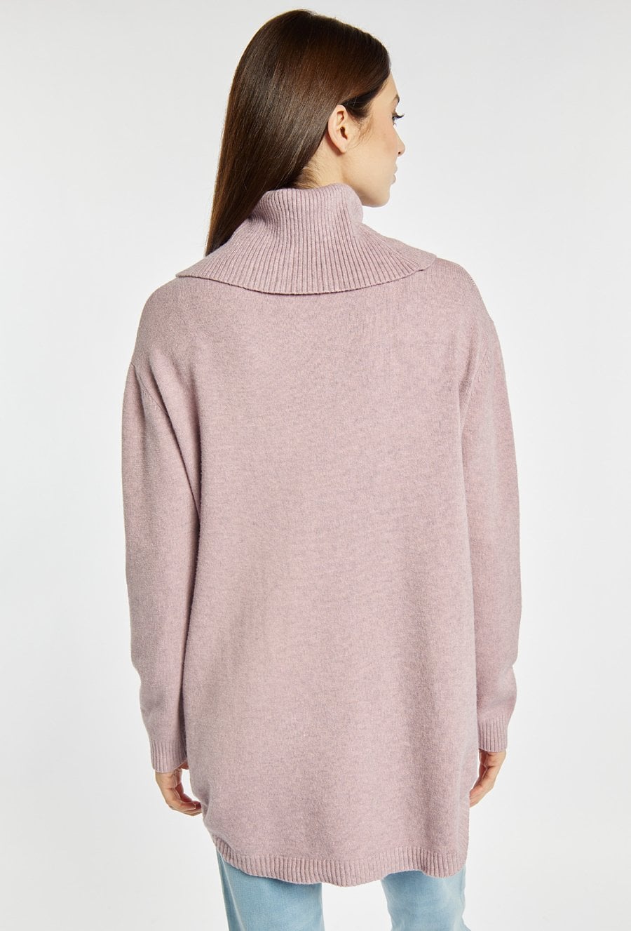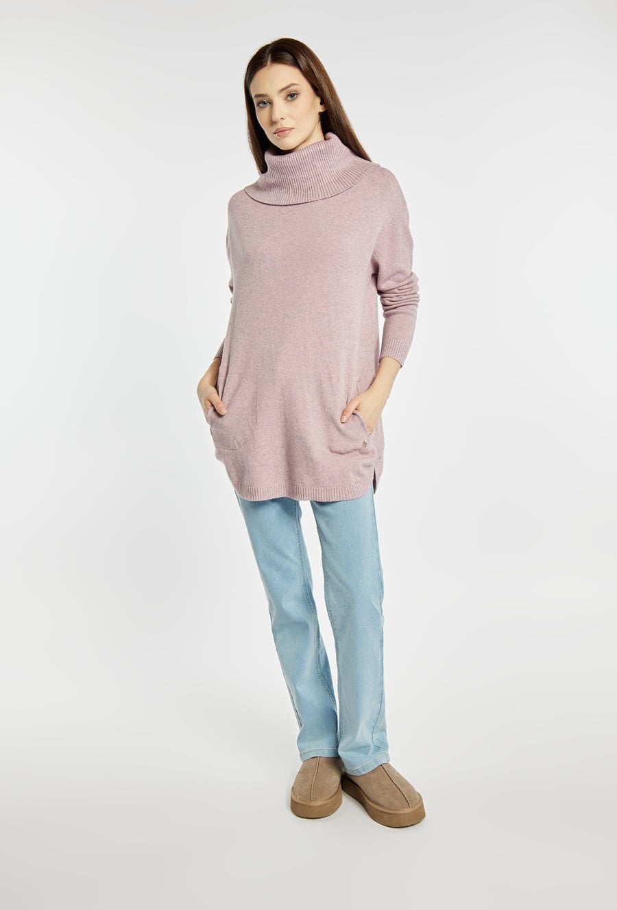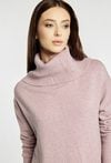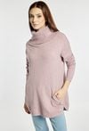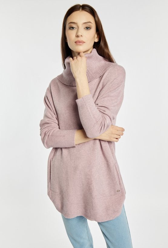 Luźny sweter damski z golfem, idealny na chłodniejsze dni. Model z długimi rękawami, kieszonkami oraz ozdobnymi guzikami po bokach, które nadają mu wyjątkowego charakteru. Sweter dostępny w kilku wariantach kolorystycznych, dzięki czemu łatwo dopasować go do różnych stylizacji. Modelka na zdjęciu ma 177 cm wzrostu i prezentuje rozmiar S/M.
