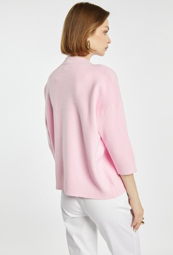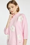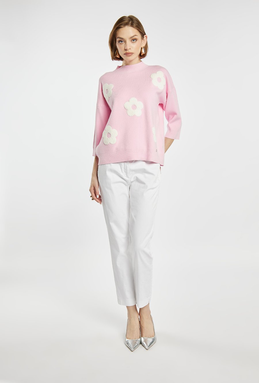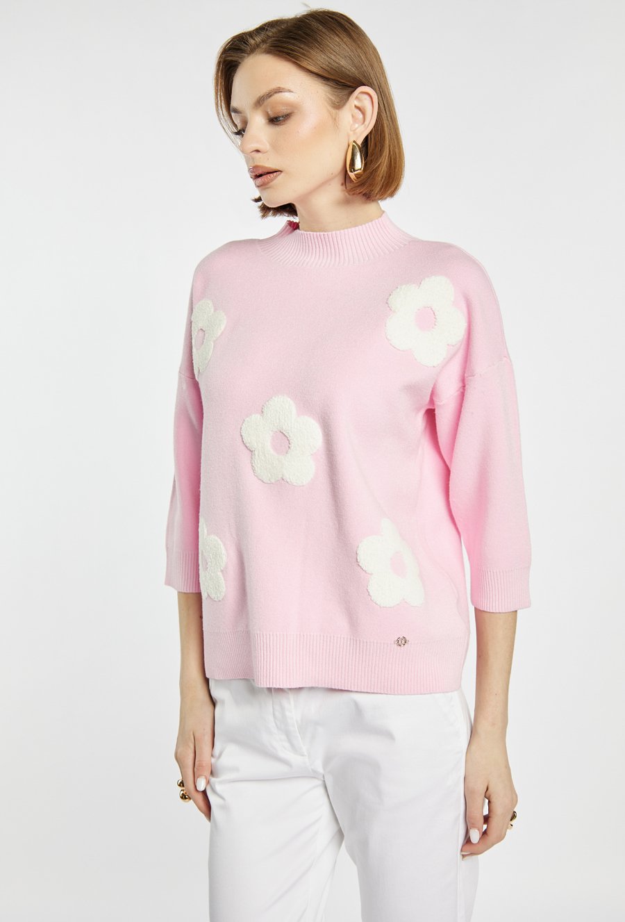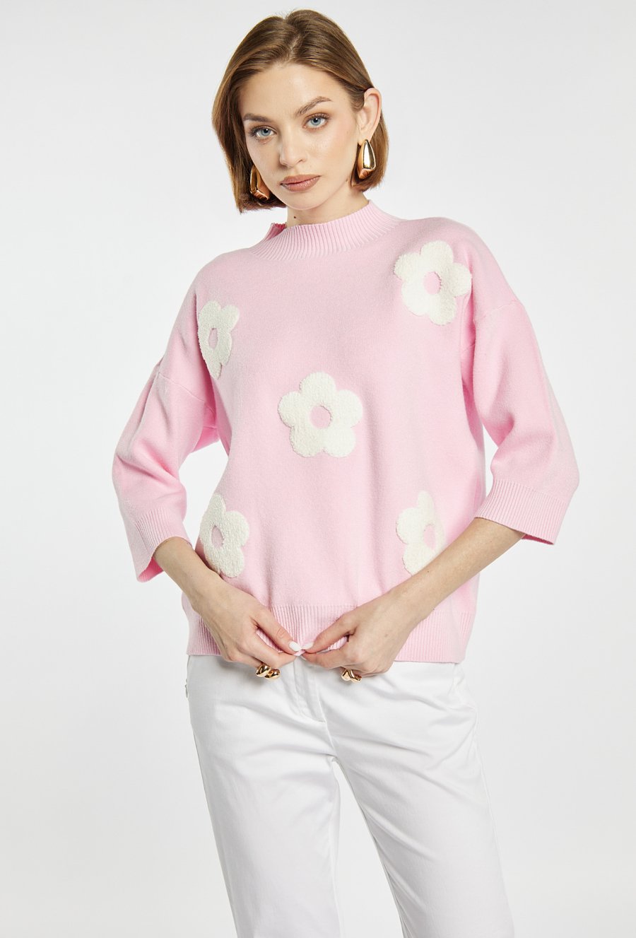 Sweter damski z kwiatowym wzorem w modnym odcieniu. Sweter z półgolfem i rękawem 3/4 łączy w sobie komfort noszenia z efektownym wyglądem. Oversize’owy krój zapewnia swobodę ruchów i świetnie wpisuje się w casualowy styl. Duże, kontrastowe aplikacje w kształcie kwiatów nadają mu wyjątkowego charakteru i wpisują się w najnowsze trendy sezonu. Modelka na zdjęciu ma 177 cm wzrostu i prezentuje rozmiar S/M.