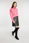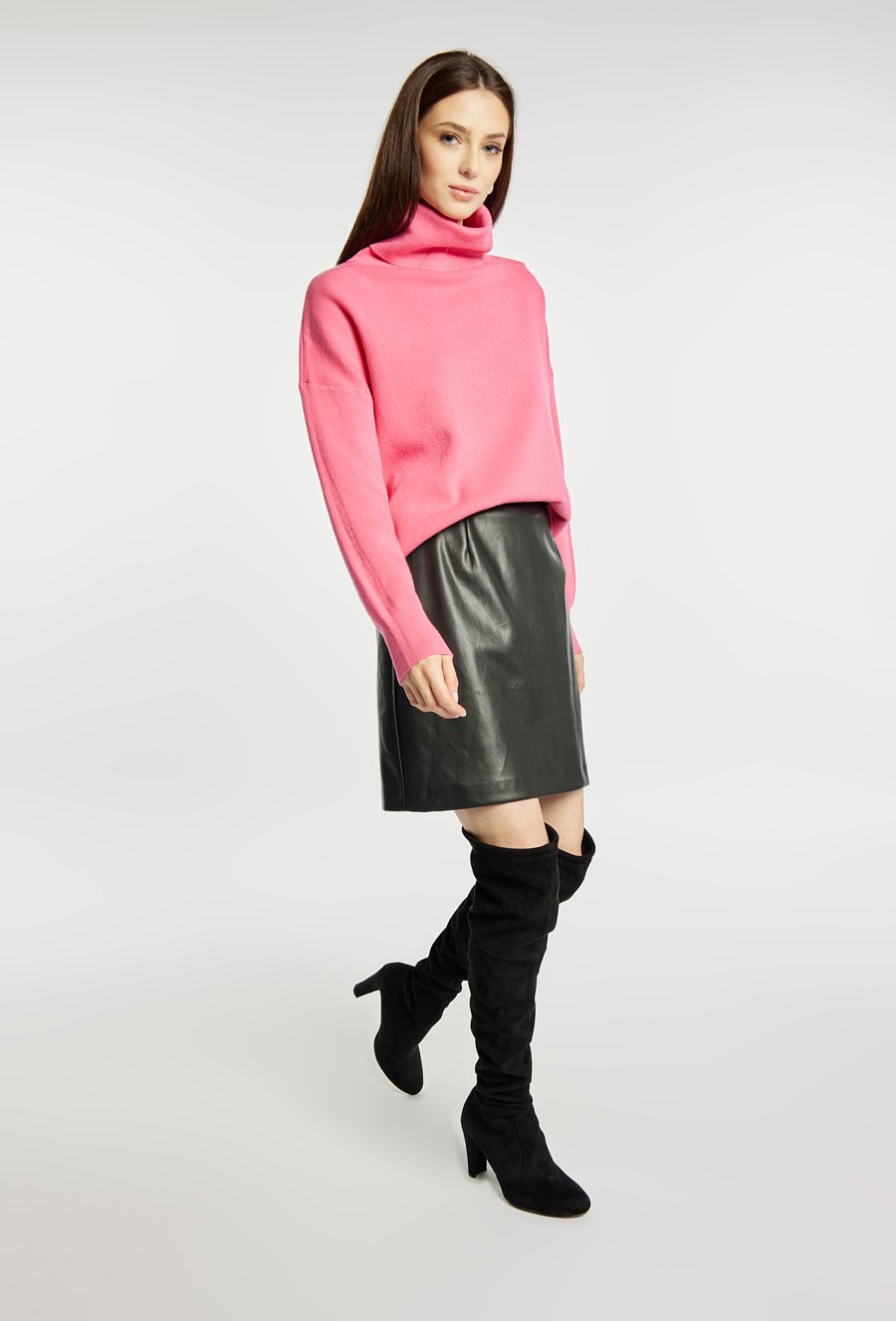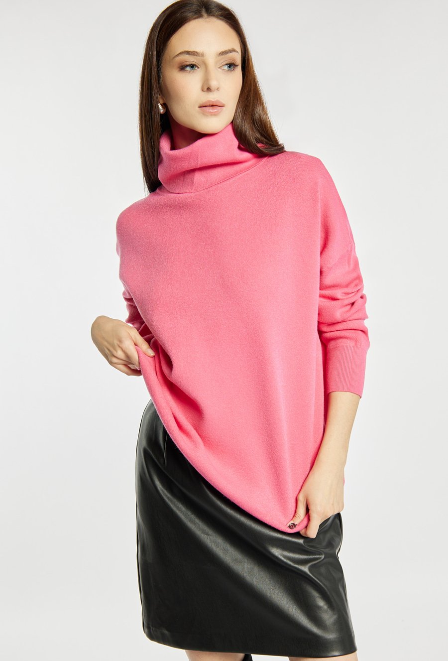 Sweter z długimi rękawami i luźniejszym golfem to miękki, przytulny model idealny na chłodniejsze dni. Sweter ma komfortowy, lekko oversize’owy krój, prążkowane wykończenia oraz drobny detal przy dole, dzięki czemu prezentuje się stylowo i uniwersalnie. Modelka na zdjęciu ma 177 cm wzrostu i nosi rozmiar S/M.