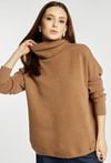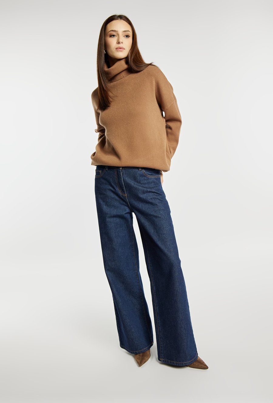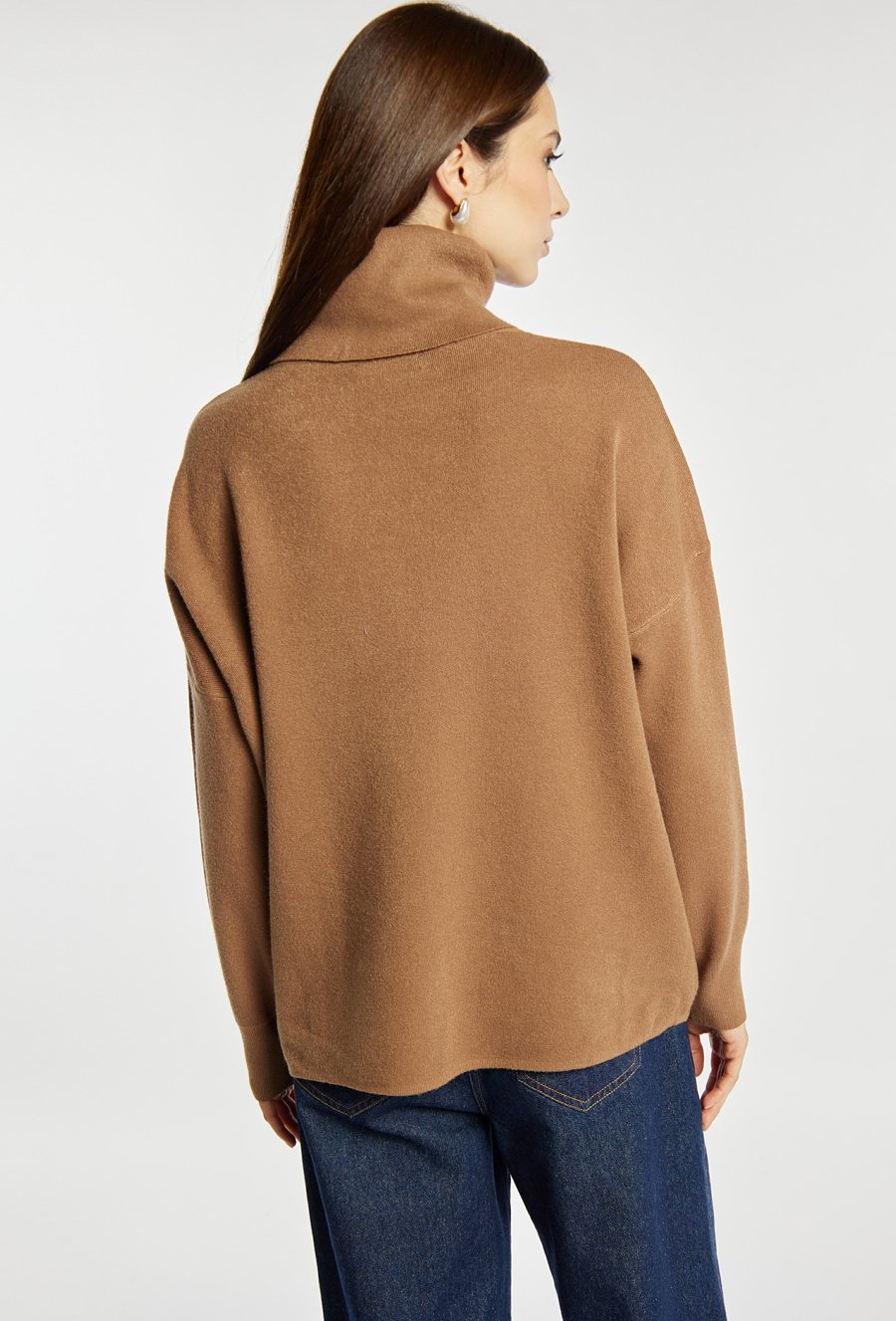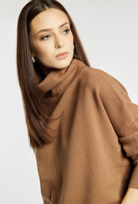 Sweter z długimi rękawami i luźniejszym golfem to miękki, przytulny model idealny na chłodniejsze dni. Sweter ma komfortowy, lekko oversize’owy krój, prążkowane wykończenia oraz drobny detal przy dole, dzięki czemu prezentuje się stylowo i uniwersalnie. Modelka na zdjęciu ma 177 cm wzrostu i nosi rozmiar S/M.