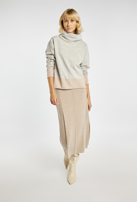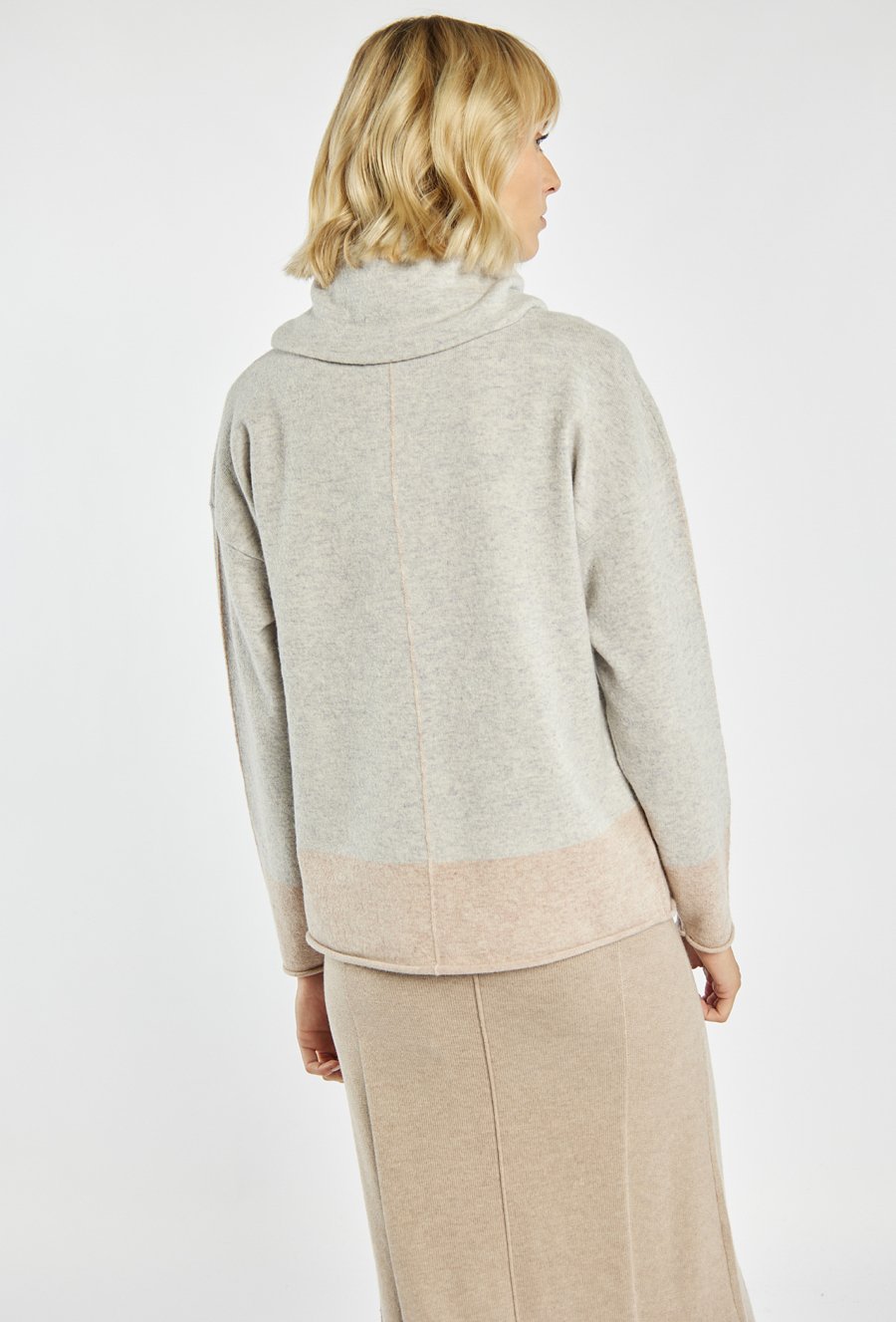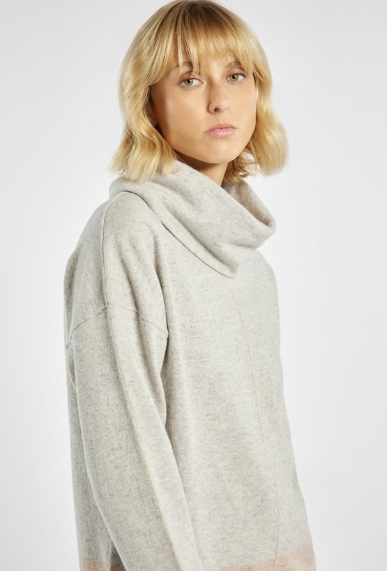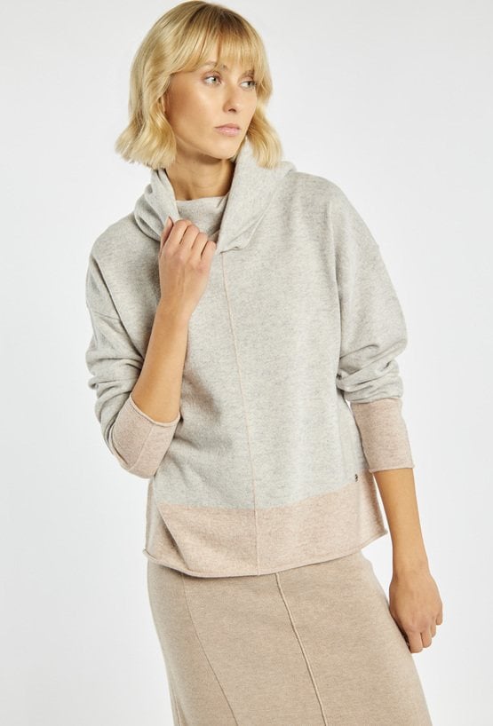 Sweter damski z wełną, o nowoczesnym kroju z szerokim, miękkim golfem. Sweter wyróżnia się wyjątkową miękkością i elegancją, idealny na chłodniejsze dni jesieni i zimy. Modelka na zdjęciu ma 177 cm wzrostu i prezentuje rozmiar S.
