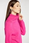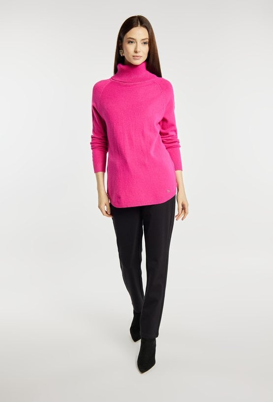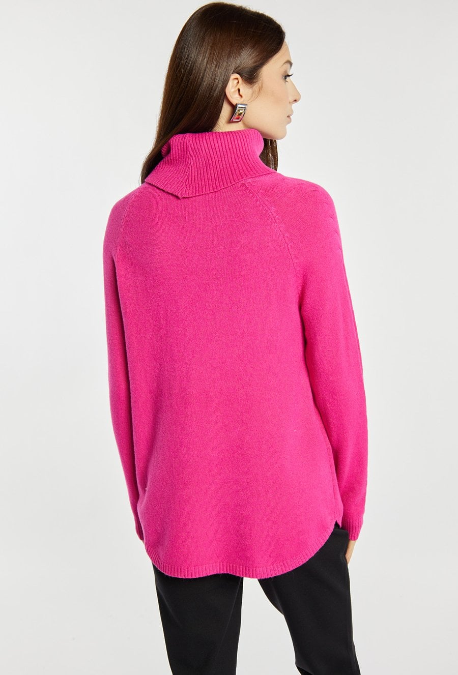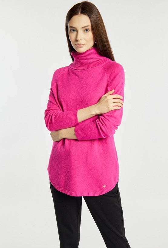Sweter damski z dodatkiem wiskozy, idealny na chłodniejsze dni. Model z długimi rękawami i luźnym golfem, zapewniający komfort i swobodę noszenia. Sweter dostępny jest w kilku wariantach kolorystycznych, co pozwala łatwo dopasować go do różnych stylizacji. Modelka na zdjęciu ma 177 cm wzrostu i prezentuje rozmiar S/M.