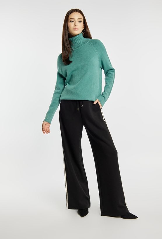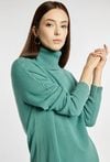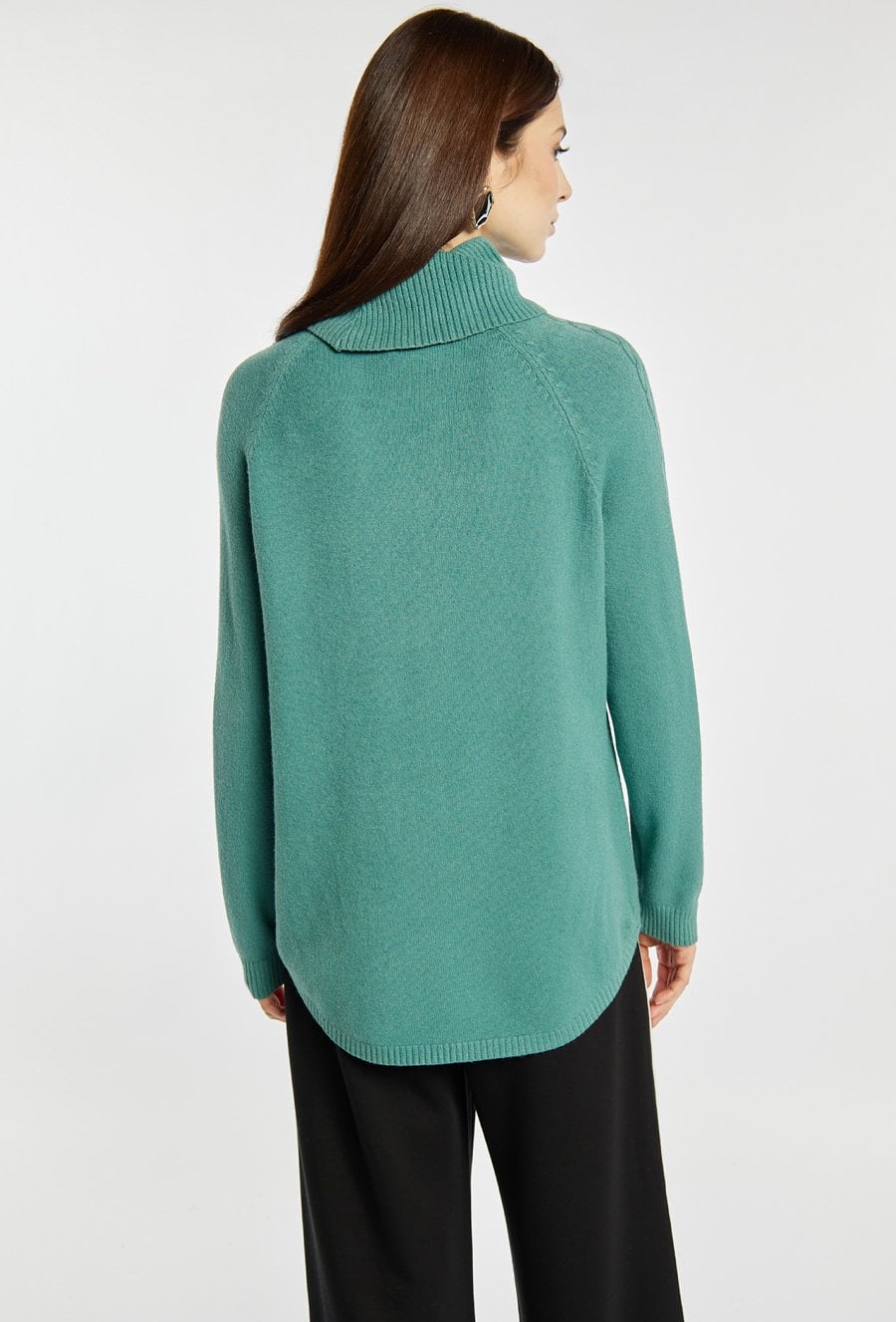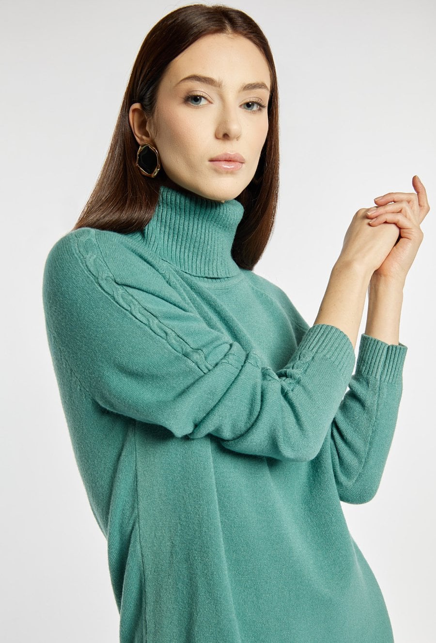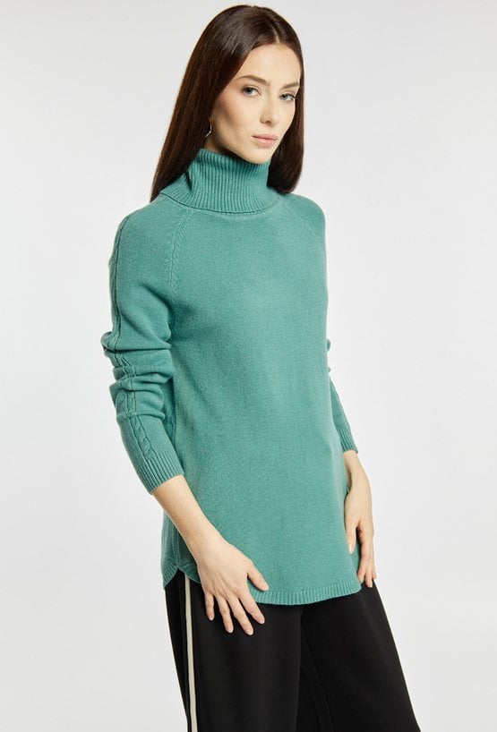 Sweter damski z dodatkiem wiskozy, idealny na chłodniejsze dni. Model z długimi rękawami i luźnym golfem, zapewniający komfort i swobodę noszenia. Sweter dostępny jest w kilku wariantach kolorystycznych, co pozwala łatwo dopasować go do różnych stylizacji. Modelka na zdjęciu ma 177 cm wzrostu i prezentuje rozmiar S/M.