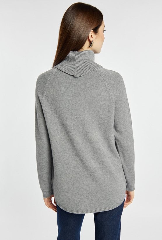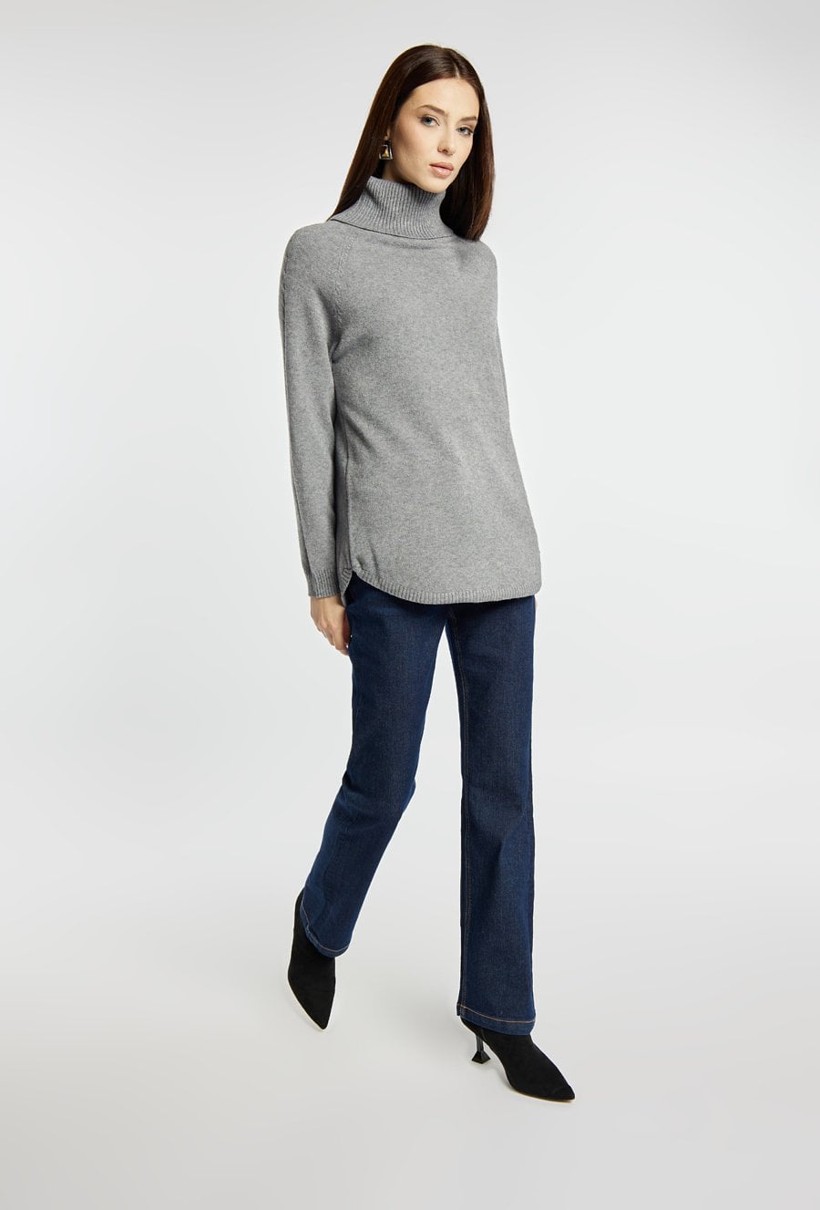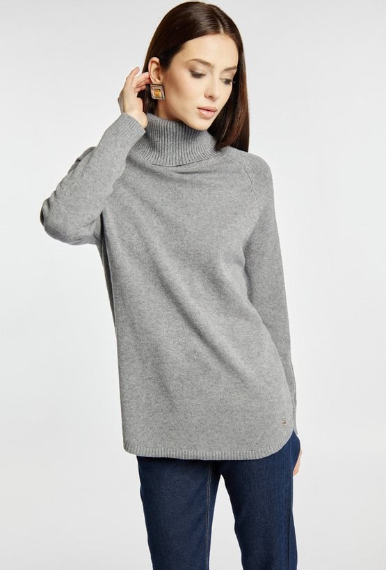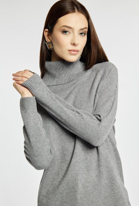 Sweter damski z dodatkiem wiskozy, idealny na chłodniejsze dni. Model z długimi rękawami i luźnym golfem, zapewniający komfort i swobodę noszenia. Sweter dostępny jest w kilku wariantach kolorystycznych, co pozwala łatwo dopasować go do różnych stylizacji. Modelka na zdjęciu ma 177 cm wzrostu i prezentuje rozmiar S/M.