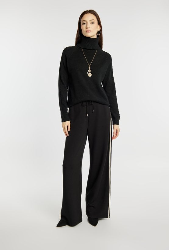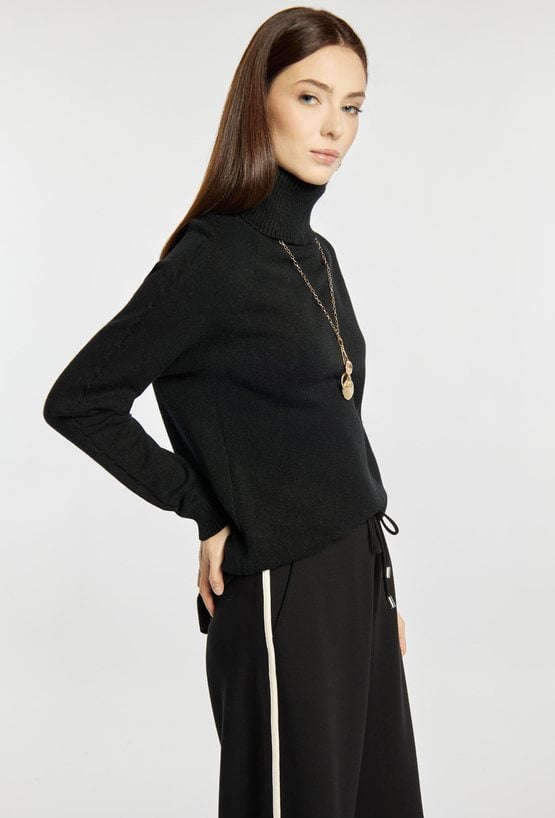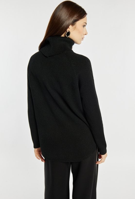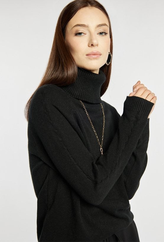 Sweter damski z dodatkiem wiskozy, idealny na chłodniejsze dni. Model z długimi rękawami i luźnym golfem, zapewniający komfort i swobodę noszenia. Sweter dostępny jest w kilku wariantach kolorystycznych, co pozwala łatwo dopasować go do różnych stylizacji. Modelka na zdjęciu ma 177 cm wzrostu i prezentuje rozmiar S/M.