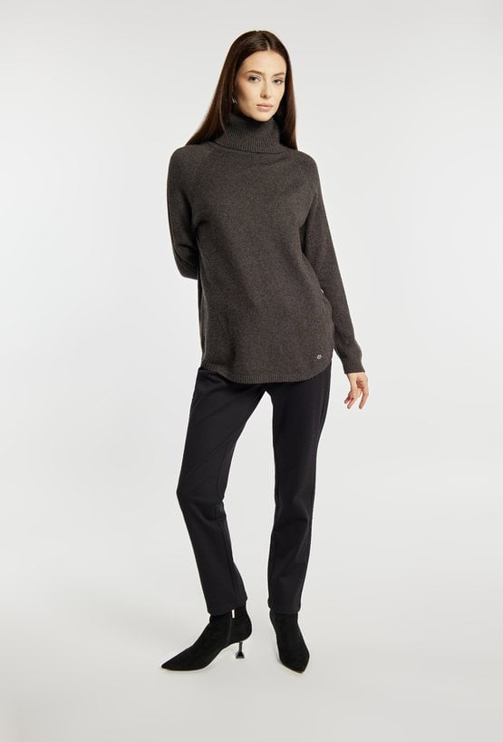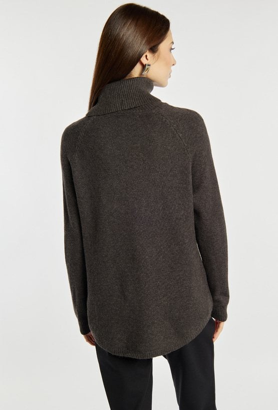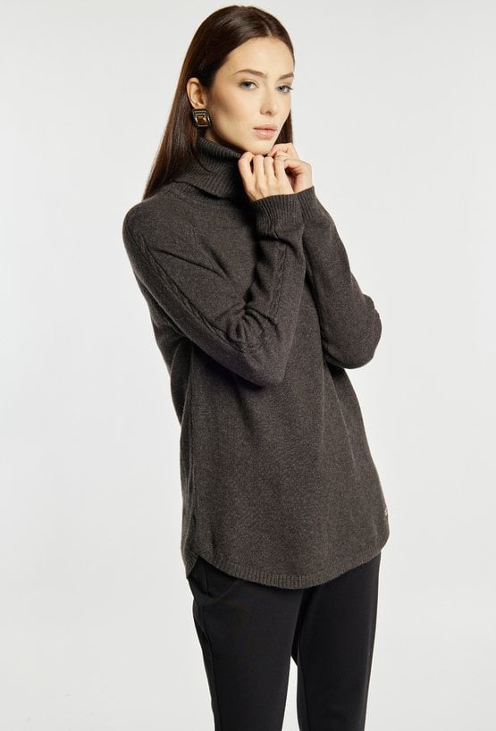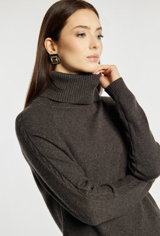 Sweter damski z dodatkiem wiskozy, idealny na chłodniejsze dni. Model z długimi rękawami i luźnym golfem, zapewniający komfort i swobodę noszenia. Sweter dostępny jest w kilku wariantach kolorystycznych, co pozwala łatwo dopasować go do różnych stylizacji. Modelka na zdjęciu ma 177 cm wzrostu i prezentuje rozmiar S/M.