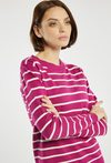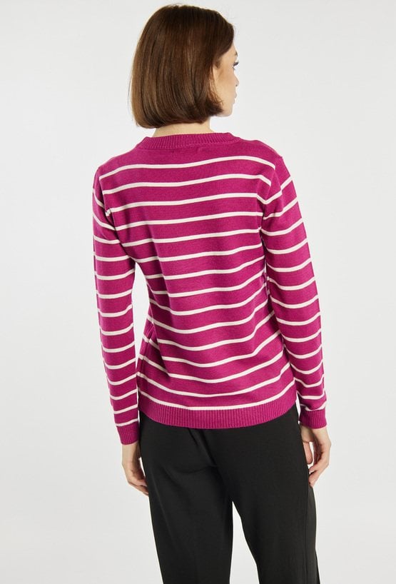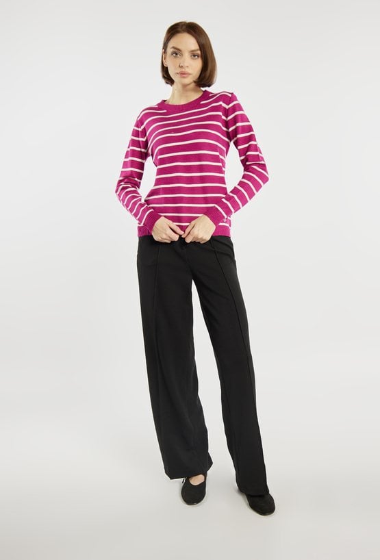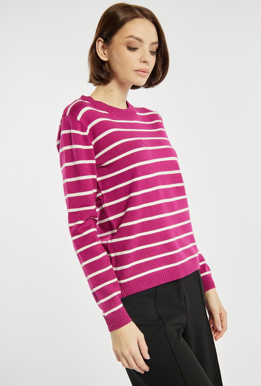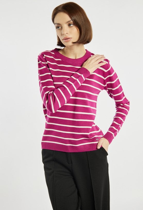 Sweter damski w paski o klasycznym kroju. Model z półgolfem i delikatnym wzorem w poziome pasy to ponadczasowa propozycja, która świetnie sprawdzi się zarówno w casualowych, jak i bardziej eleganckich stylizacjach. Modelka na zdjęciu ma 177 cm wzrostu i prezentuje rozmiar S/M.