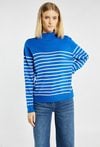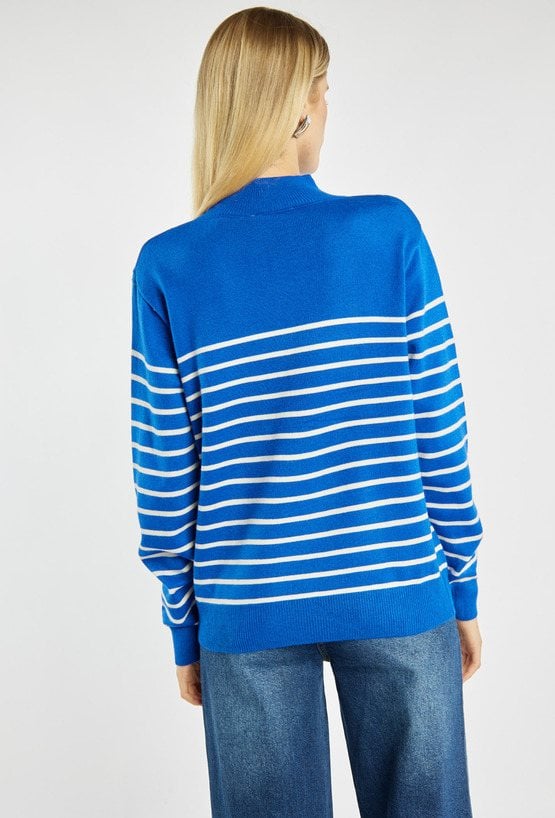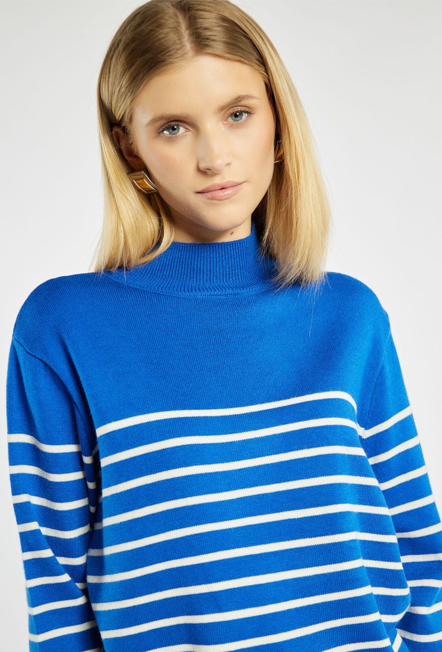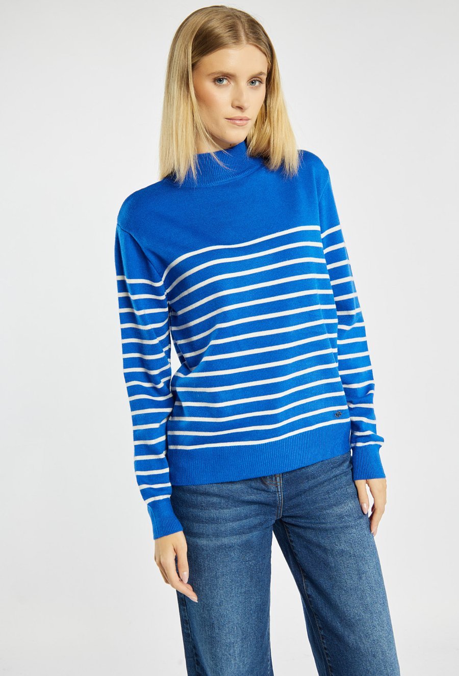 Sweter damski w paski o klasycznym kroju. Model z półgolfem i delikatnym wzorem w poziome pasy to ponadczasowa propozycja, która świetnie sprawdzi się zarówno w casualowych, jak i bardziej eleganckich stylizacjach. Modelka na zdjęciu ma 177 cm wzrostu i prezentuje rozmiar S/M.
