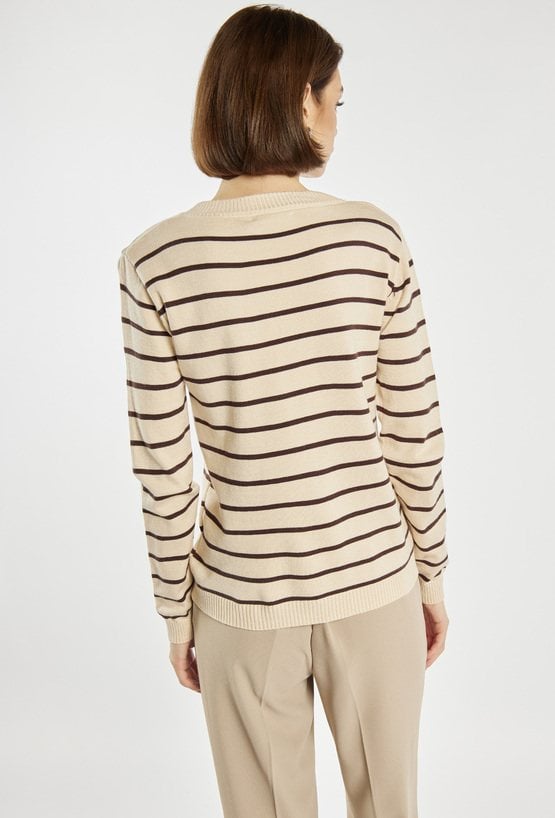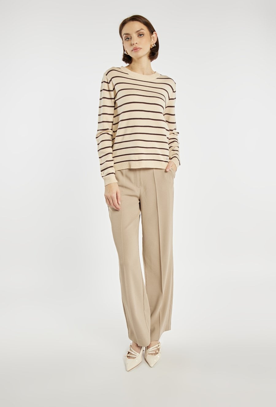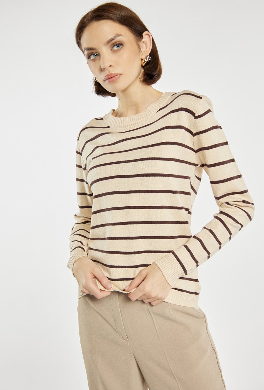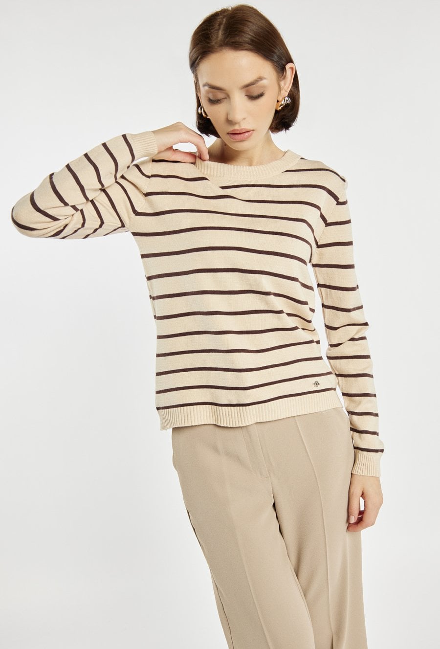 Sweter damski w paski o klasycznym kroju. Model z półgolfem i delikatnym wzorem w poziome pasy to ponadczasowa propozycja, która świetnie sprawdzi się zarówno w casualowych, jak i bardziej eleganckich stylizacjach. Modelka na zdjęciu ma 177 cm wzrostu i prezentuje rozmiar S/M.